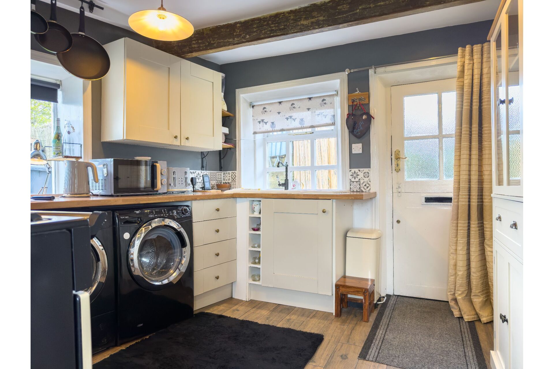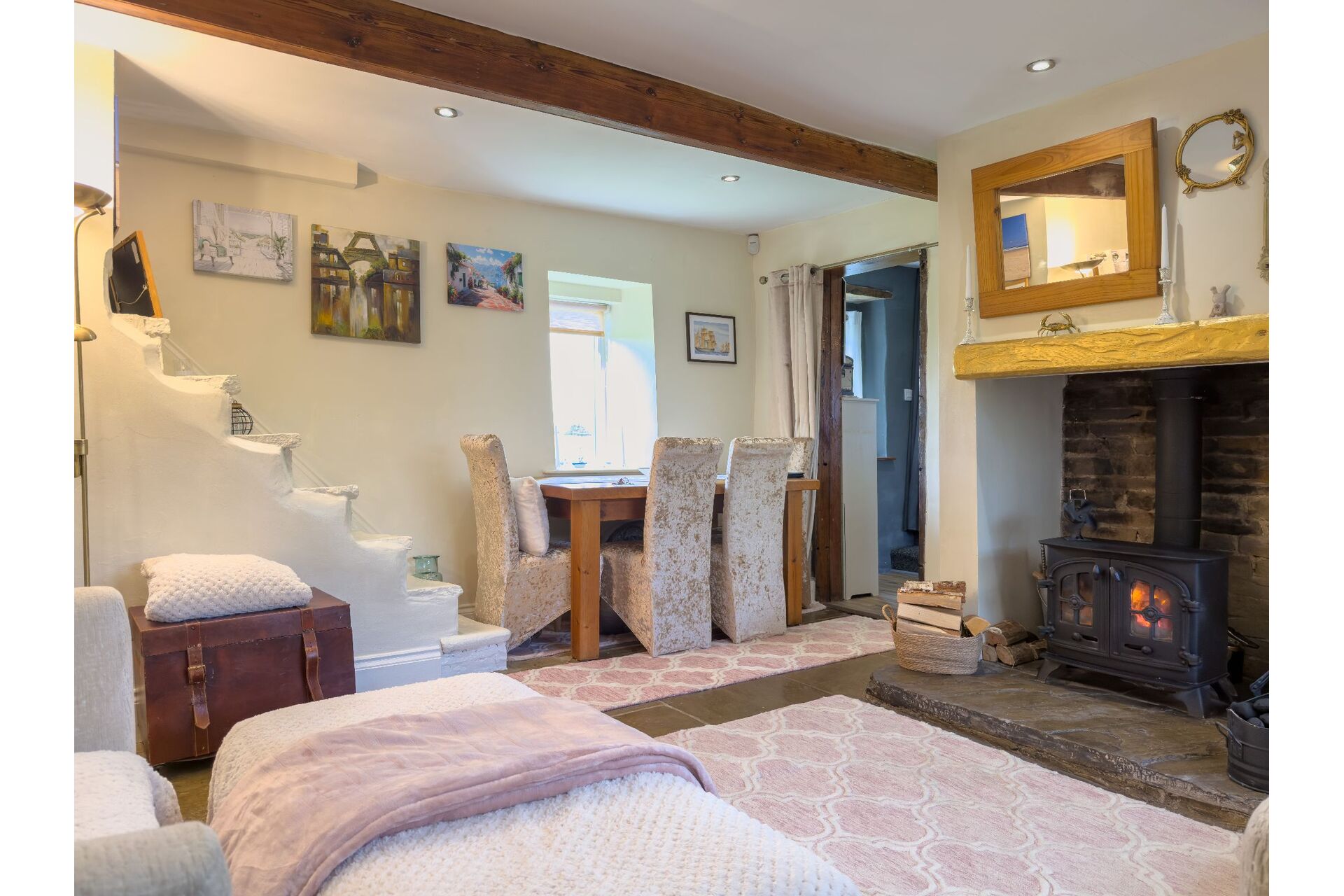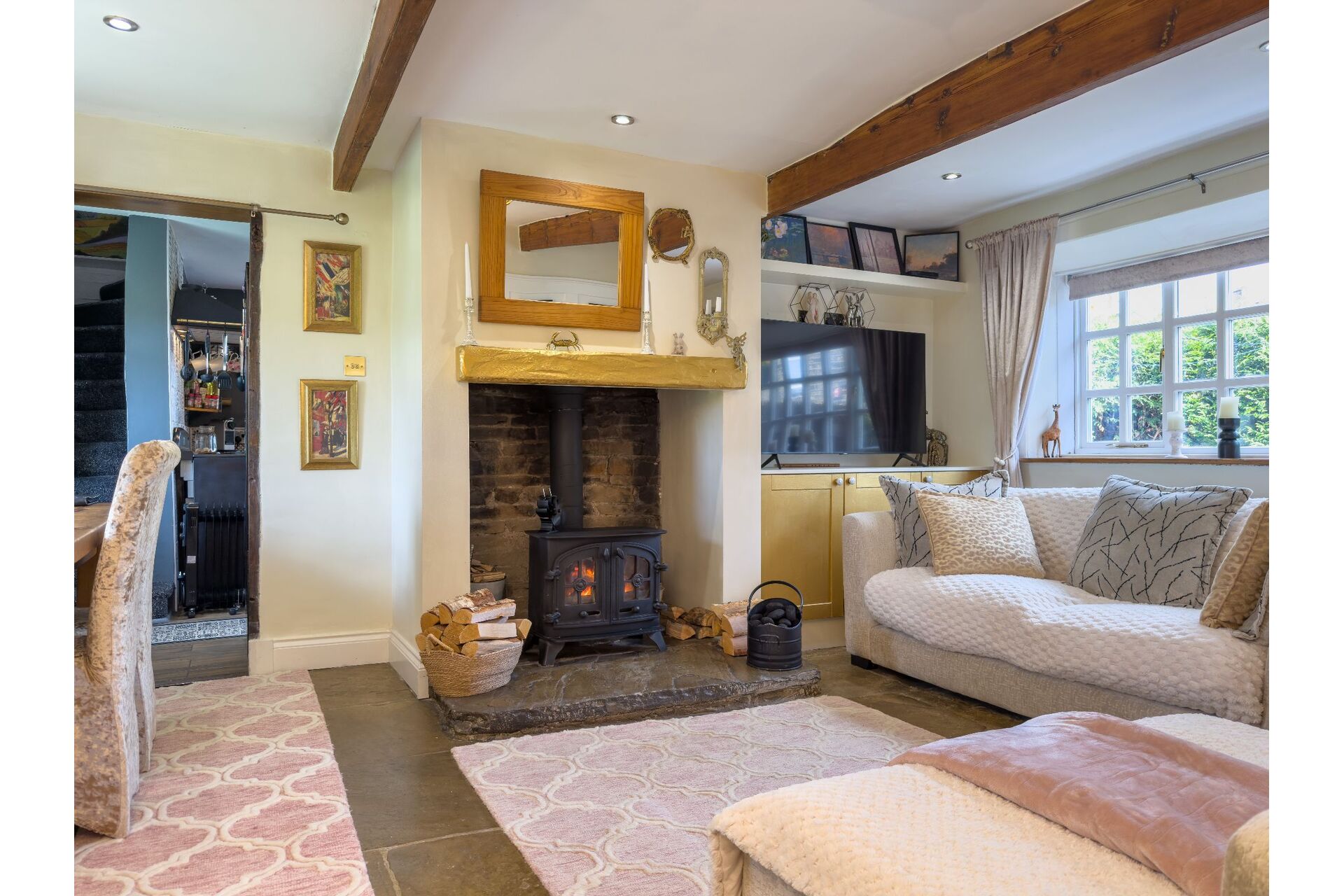 The heart of the home is the cosy lounge, featuring a magnificent stone flagged floor and a large multi-fuel stoveperfect for winter evenings. Look closely and you’ll find a fascinating 'staircase to nowhere,' a nod to the property’s storied past. The ground floor is bathed in natural light thanks to dual-aspect windows, leading through to a well-appointed cottage kitchen complete with a Dual Fuel Rangemaster.