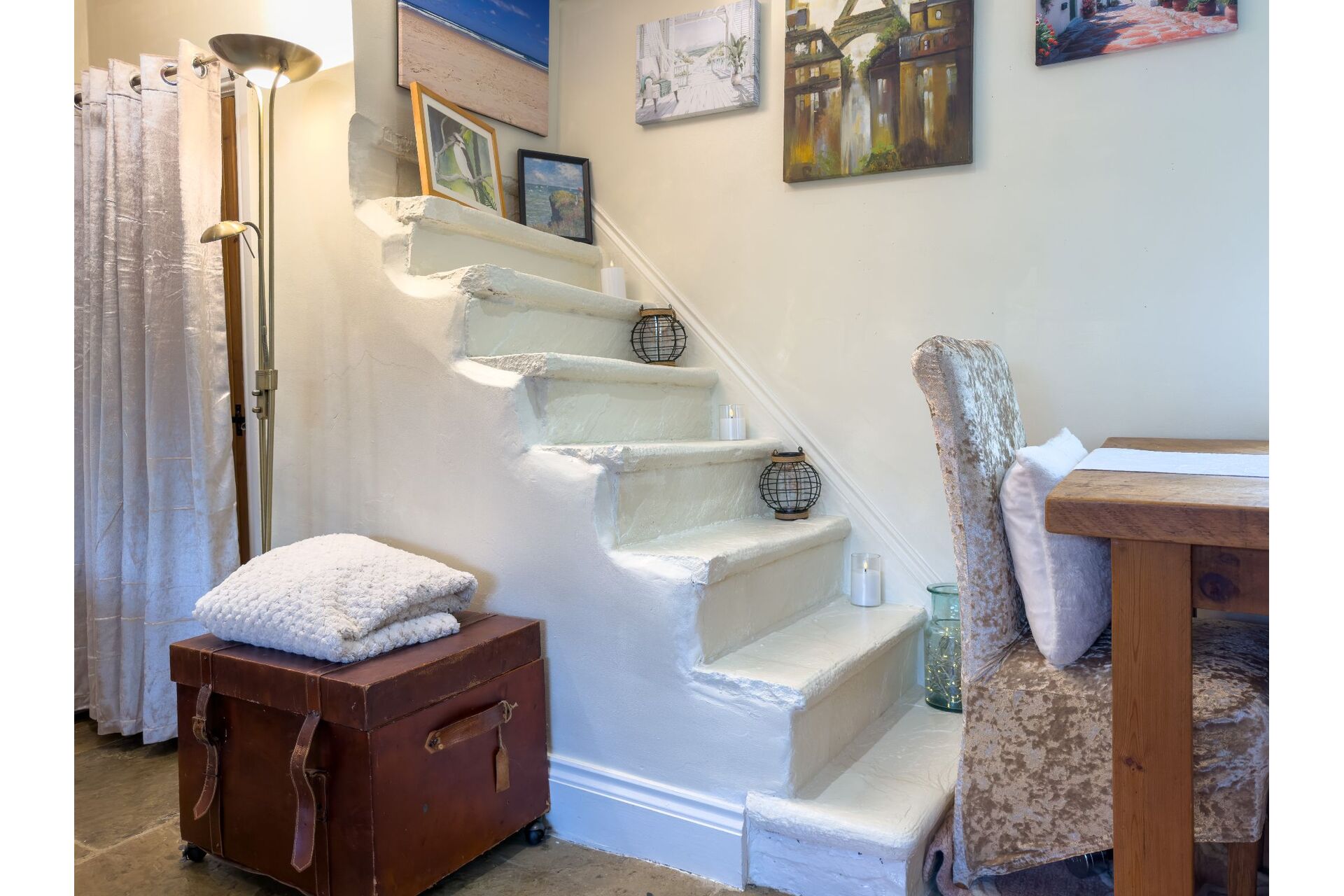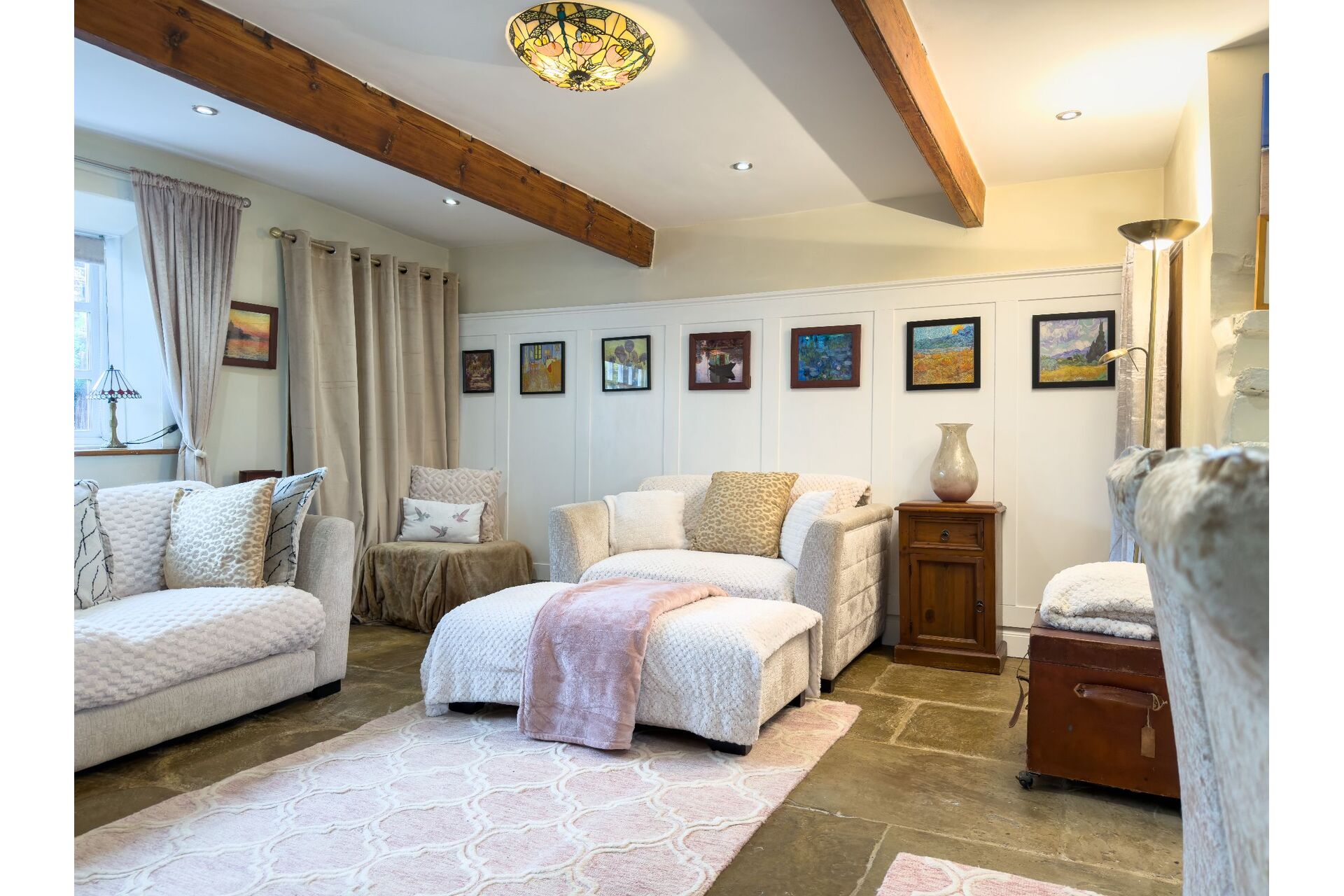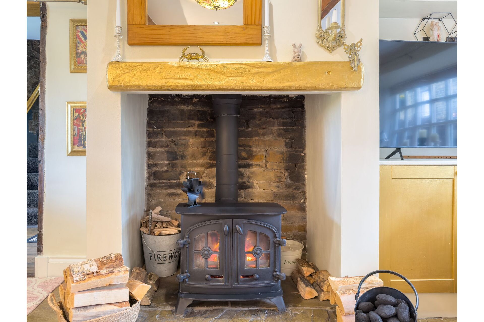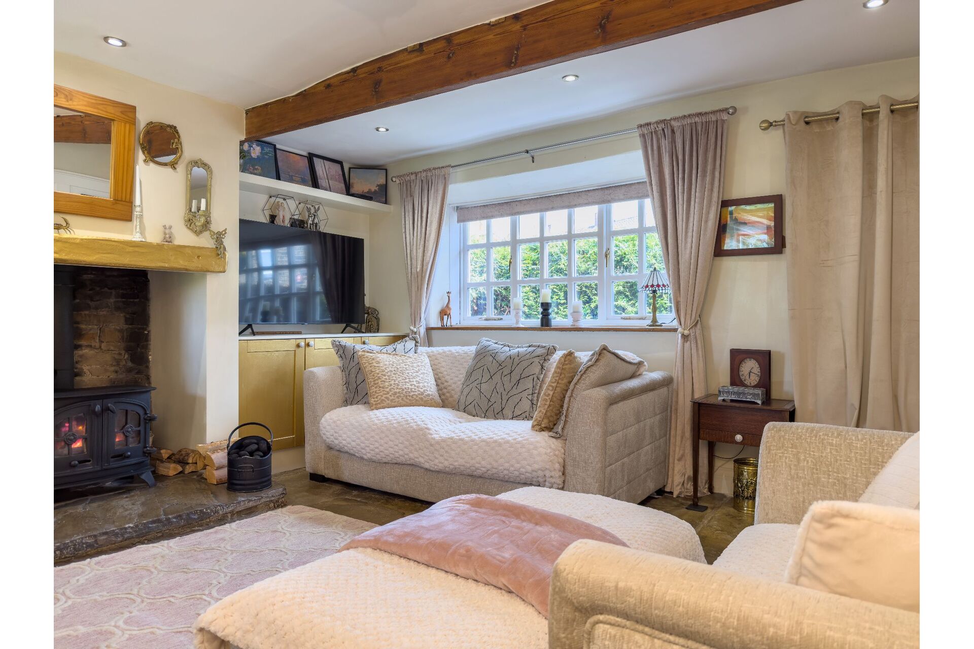 The heart of the home is the cosy lounge, featuring a magnificent stone flagged floor and a large multi-fuel stoveperfect for winter evenings. Look closely and you’ll find a fascinating 'staircase to nowhere,' a nod to the property’s storied past. The ground floor is bathed in natural light thanks to dual-aspect windows, leading through to a well-appointed cottage kitchen complete with a Dual Fuel Rangemaster.