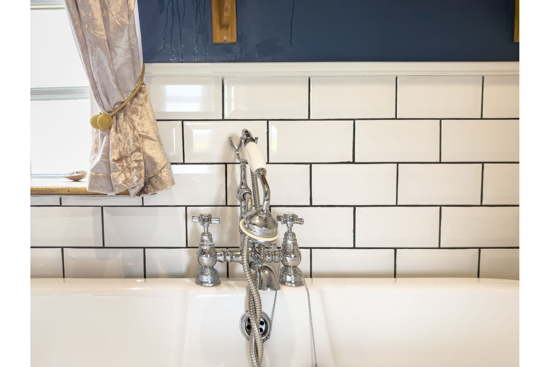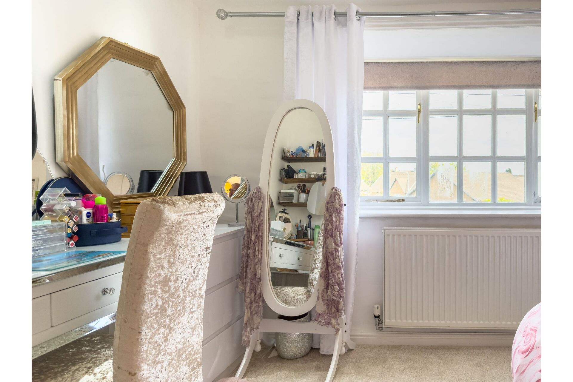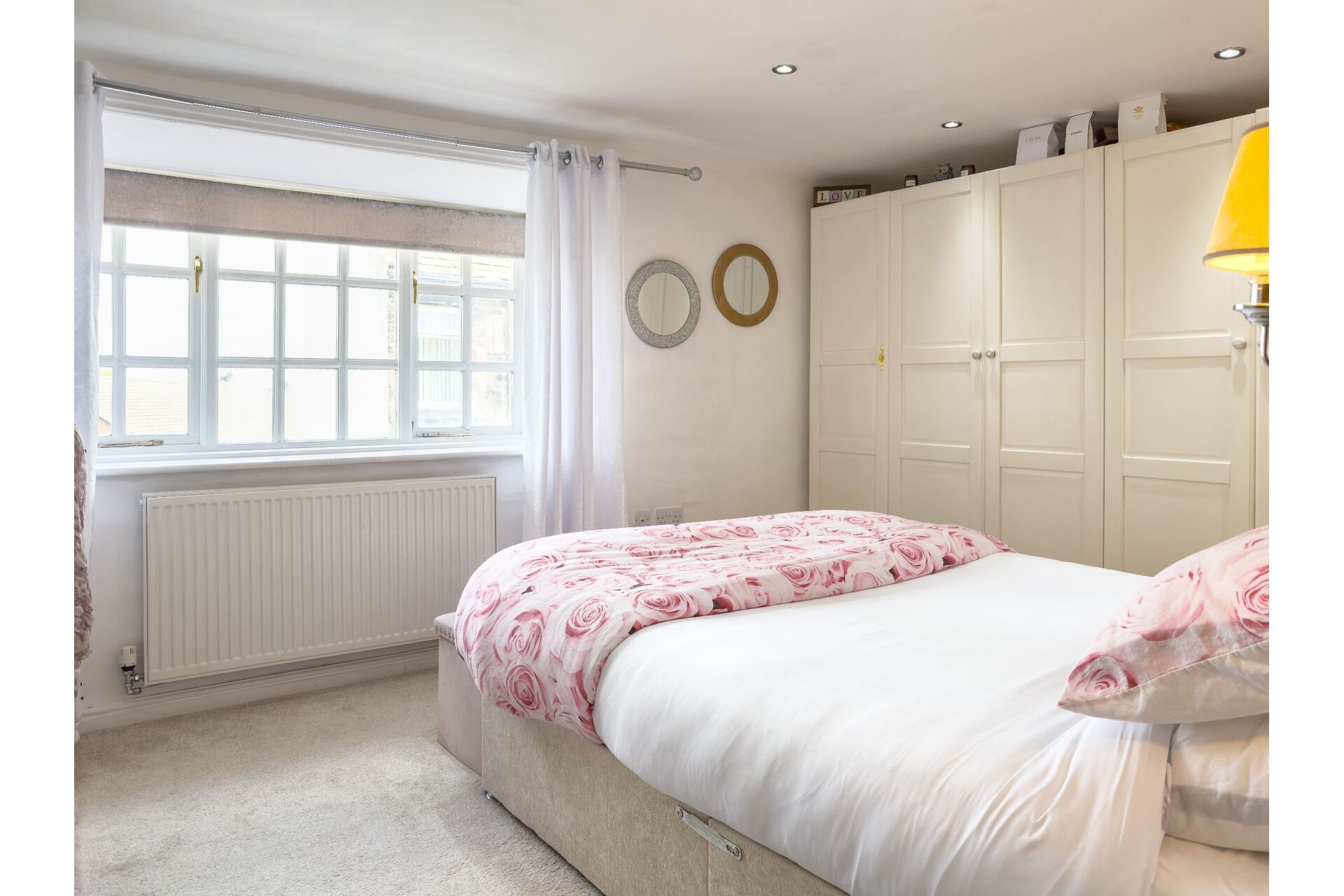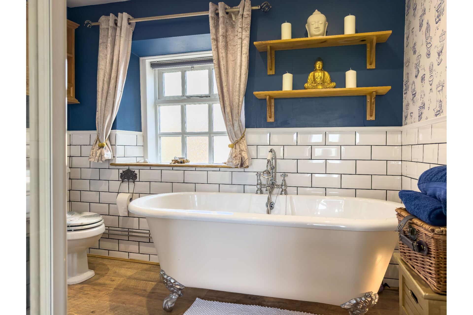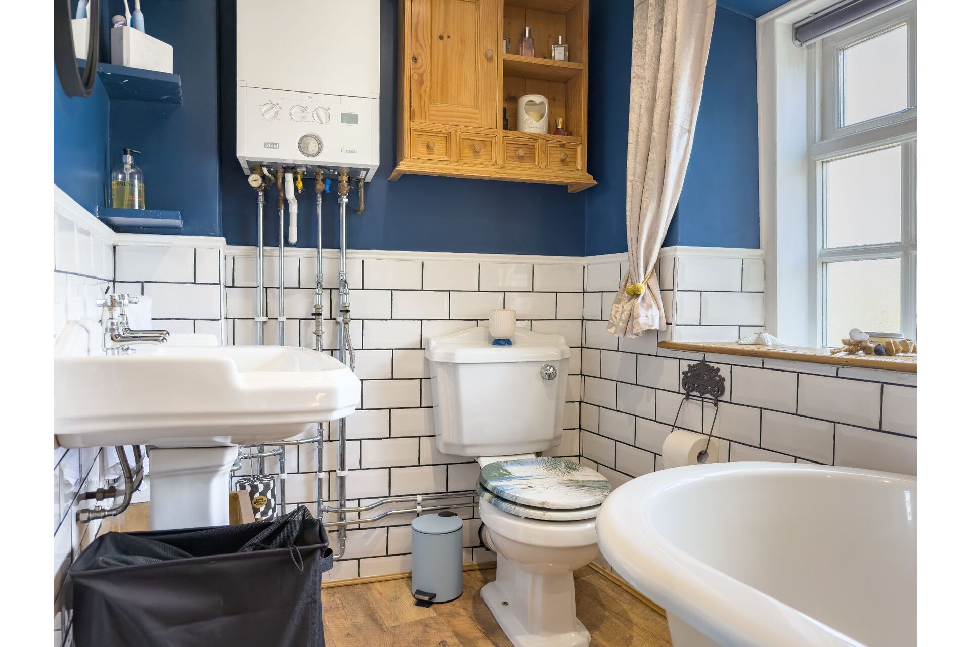 A truly luxurious house bathroom incorporating a four-piece timeless suite which includes a freestanding bath with a chrome mixer tap shower. There is a walk-in shower enclosure, a large wash basin and a low flush toilet. The boiler is wall mounted and is enhanced by chrome pipework which really does fit in well. Half tiling to the walls and to finish this wonderful room off there is a ornate column radiator with towel warmer. Sealed unit double glazed window.
