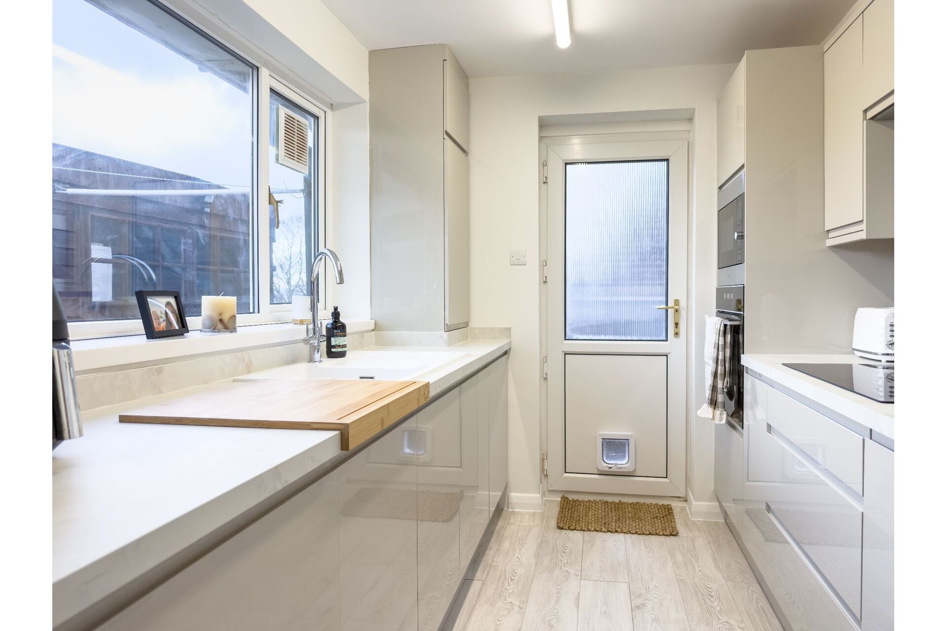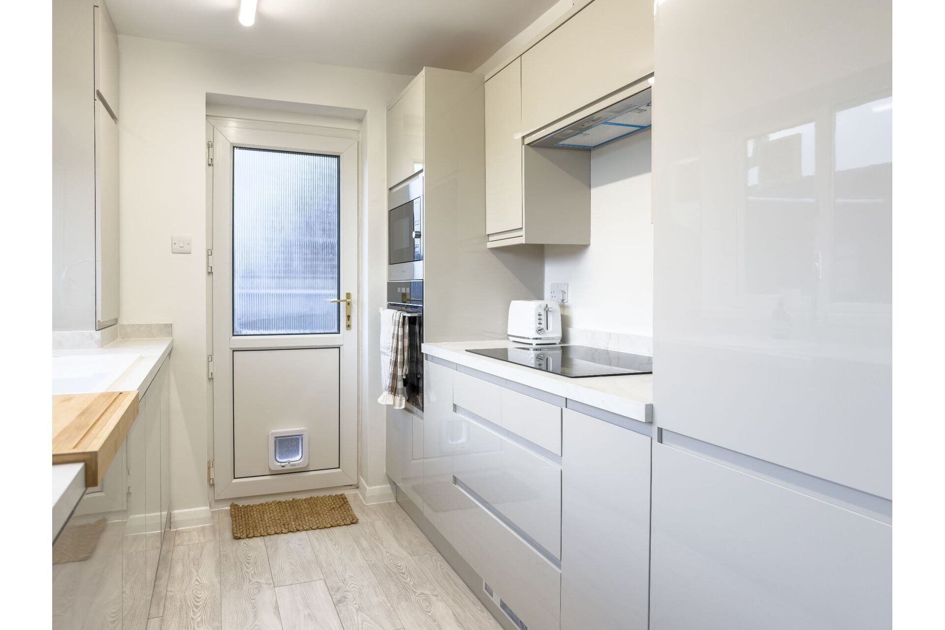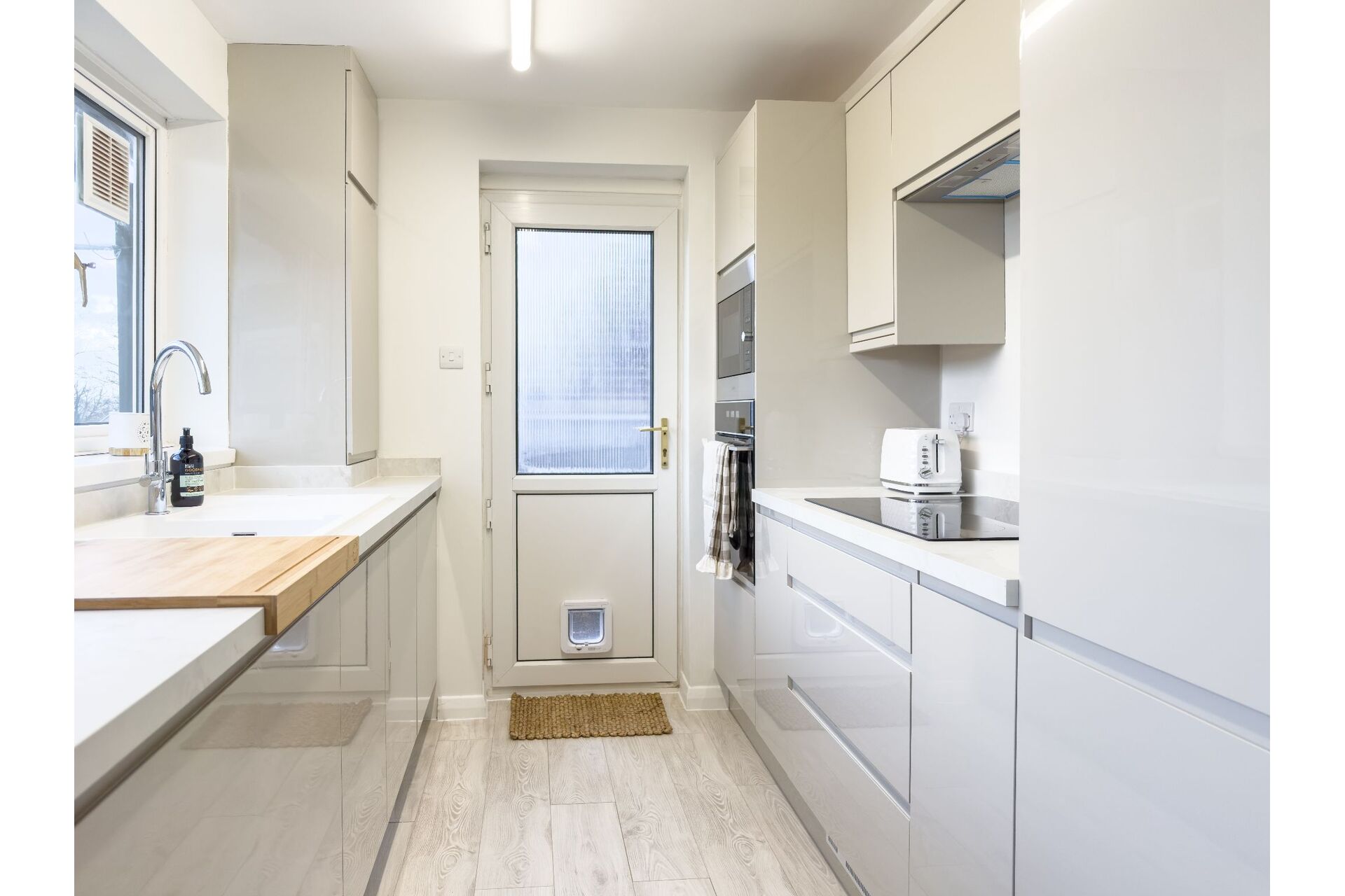 A newly fitted kitchen incorporating a range of wall and base cabinets in soft grey with laminate work tops over. There is a built-in fridge freezer, an electric oven, a microwave and an induction hob with an extractor over. A large, double-glazed window provides pleasant views over the rear garden. Cupboard housing the combination boiler. Exterior PVC door.