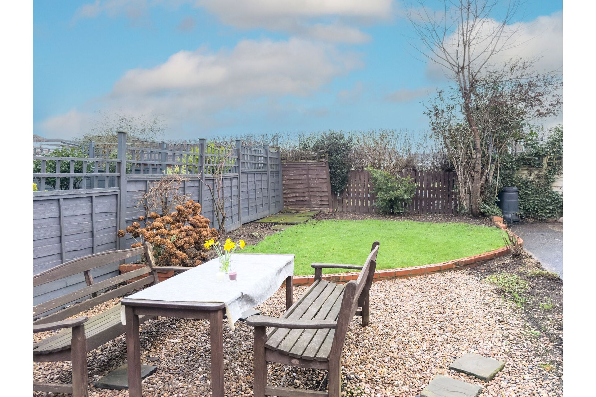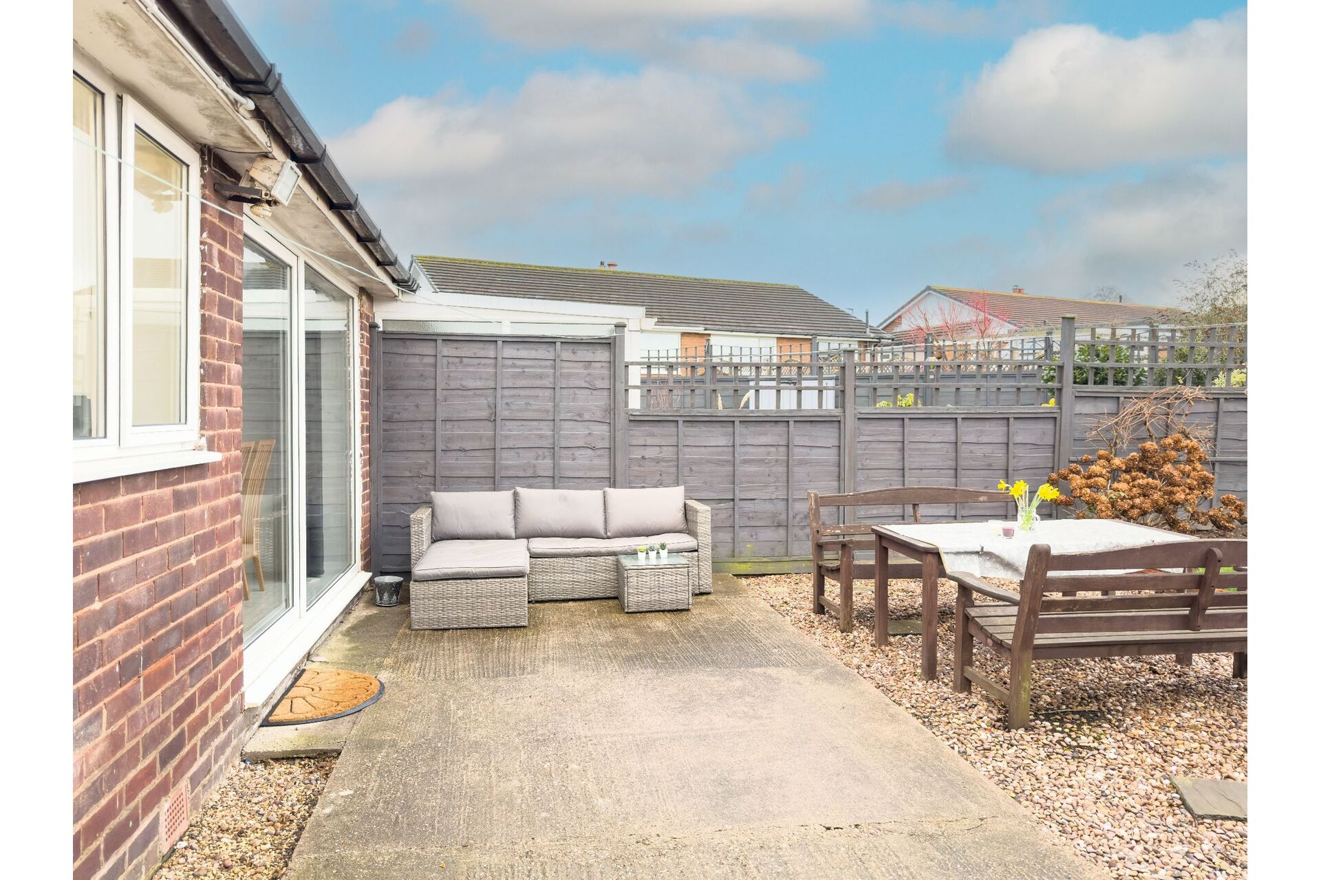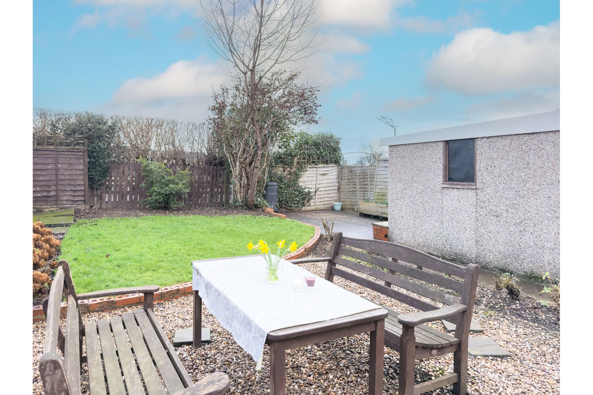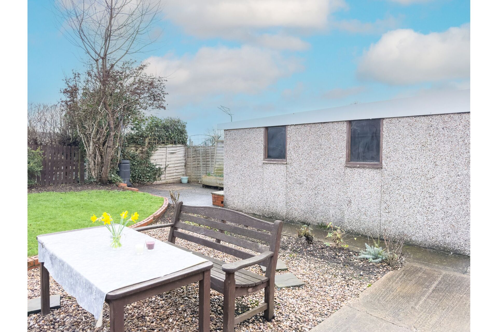 To the front of the bungalow there is a small garden with mature shrubs. A concrete drive provides parking to the front and continues to the right-hand side of the property providing access to the single detached Grimston garage. The rear garden has a hard standing seating area and a mature lawned garden.