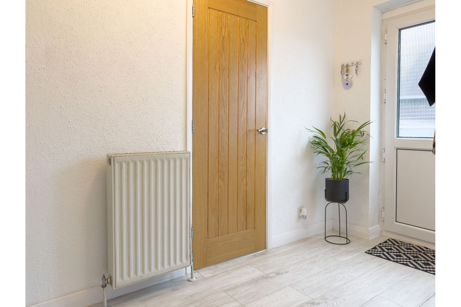 A PVC external door provides access into a side entrance hallway which is complimented by wood effect laminate floor covering. A useful storage cupboard and a central heating radiator. Access to the following rooms.