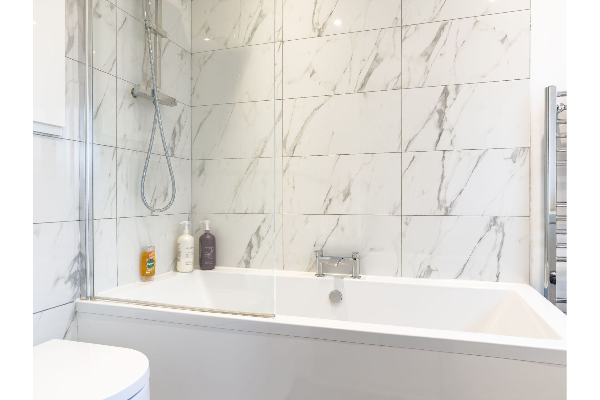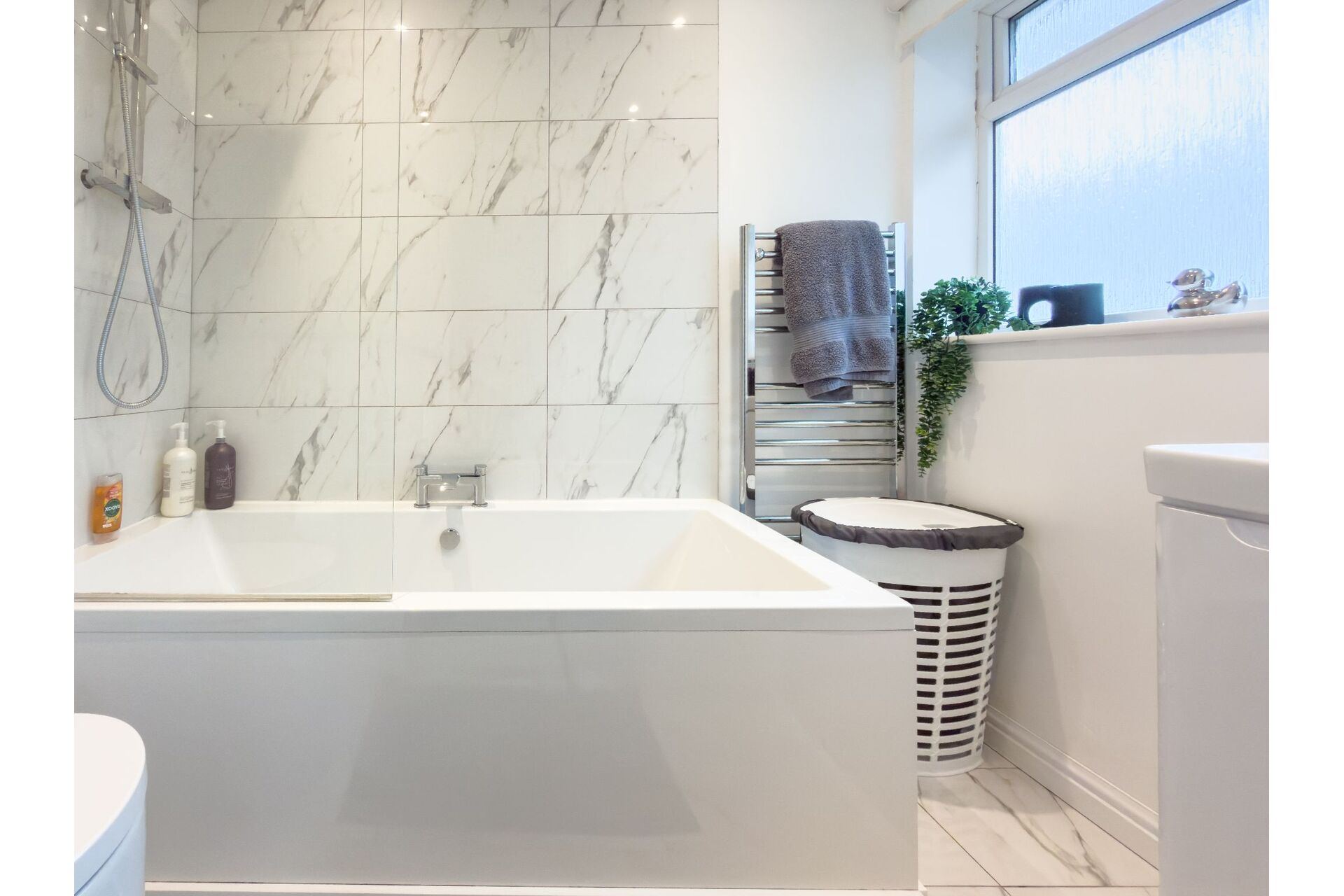 A modern, newly fitted & fully tiled bathroom comprising of a double ended bath with a twin head thermostatic bar shower over and glass screen. A vanity unit with cupboard storage houses the wash basin and there is a back to wall toilet with a concealed cistern. Chrome heated towel rail and a double-glazed window.