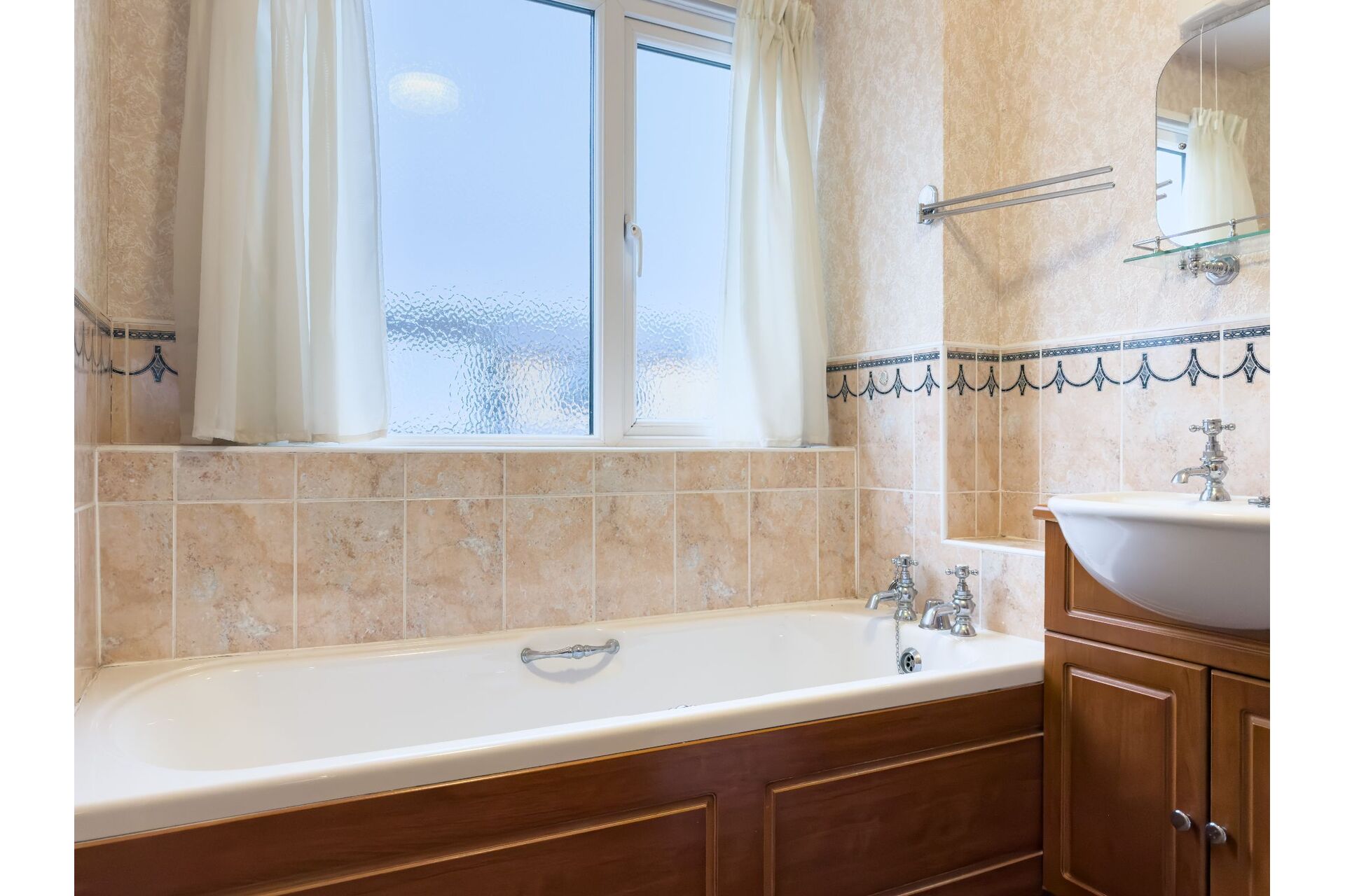 Incorporating a three-piece suite to include a panelled bath, there is a vanity unit which houses the wash basin and the back to wall toilet with a concealed cistern within. Half tiling to the walls. Double glazed window.