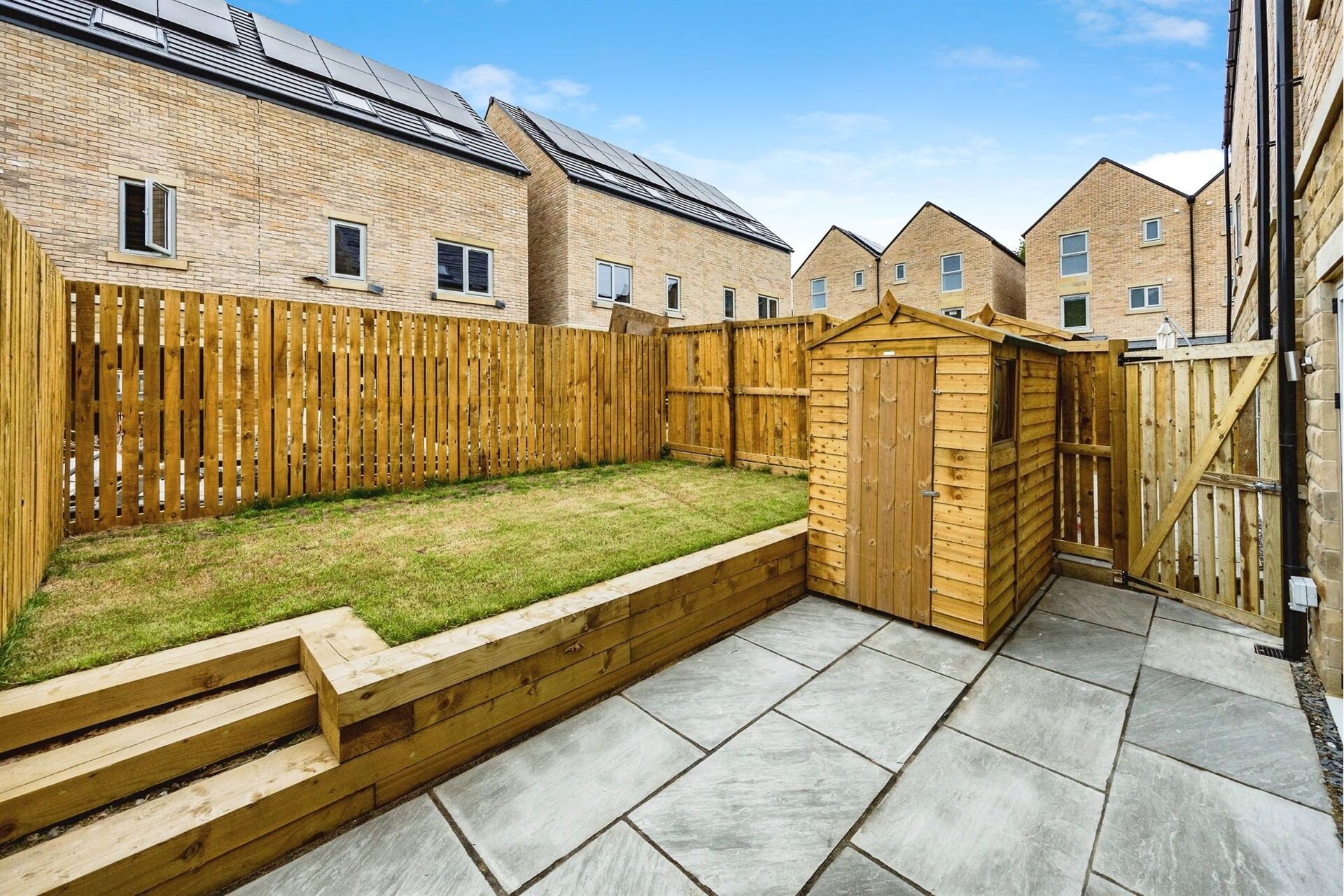 Enclosed rear garden with an Indian stone flagged patio area & paths to the front and side of the properties. Front and Rear external lights. Off-street parking for two cars.