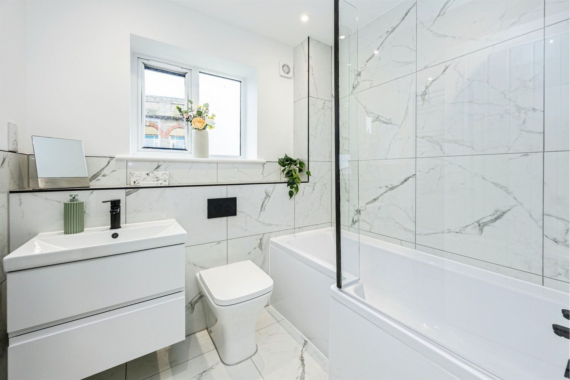 Bathroom is complimented by part tiled walls in marble effect tiles. An L shape shower bath with a thermostatic bar shower over with a rainfall shower head and a low level shower hose for bath use. Vanity unit as standard with a white wash basin and a close coupled toilet. Chrome taps & fittings along with a chrome heated Towel Radiator. Double glazed window.