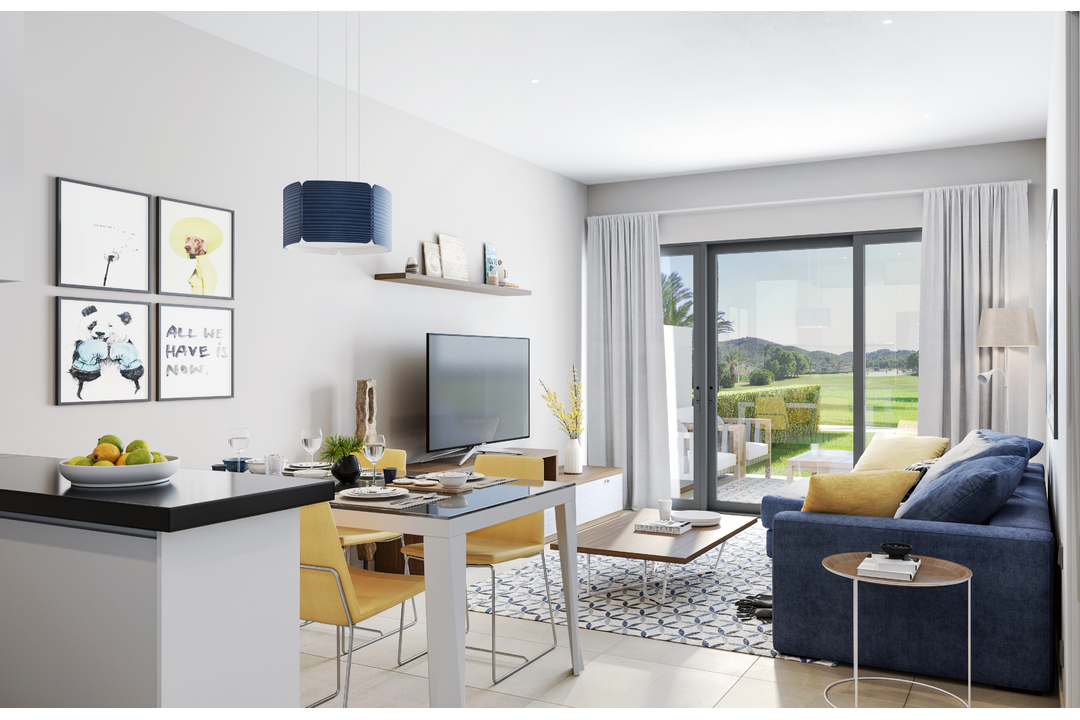 Two bedroom, two bathroom apartments front line to the golf course. The apartments are spacious and just two minutes walk from the supermarket, shops and all amenities. The ground floor apartments have a large garden and the penthouse apartments have a solarium.