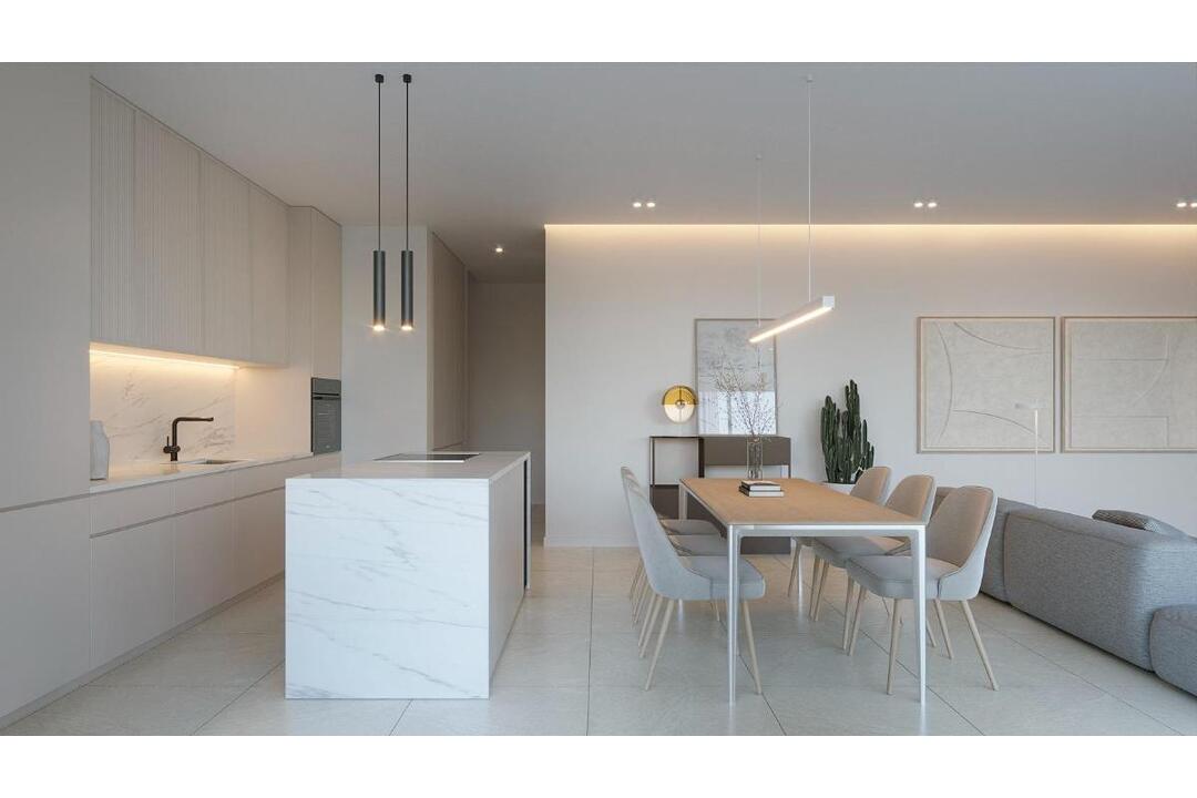 NEW BUILD RESIDENTIAL COMPLEX IN LA NUCIA New Build residential complex of apartments and penthouses with outdoor communal pool, parking, storage room, lift, gym, communal spa with indoor heated pool, sauna, jacuzzi in La Nucia. Modern properties with 2 and 3 bedrooms, all with 2 bathrooms, open plan kitchen with spacious living room, fitted wardrobes, terrace, underground parking space. Penthouses has private solariums. Excellence in its avant-garde architecture, exquisite finishes and high-end services, a dream urbanization for those looking for the highest level of comfort and distinction. Interiors that combine elegant design and modern sophistication, create spaces that turn every day into an exceptional experience of comfort and well-being. German designer kitchen, Burger or similar, with Silestone worktop, fully equipped. Siemens appliances or similar. Induction hob, extractor fan, oven and fridge and dishwasher integrated in the units. Reinforced access door to the property with security lock finished with lacquered panelling to match the interior carpentry. Option to fit lock with remote control from smartphone or tablet. Modular wardrobes with hinged or sliding doors lacquered to match the rest of the carpentry, including boot, drawers and hanging rail. The property will be prepared to be able to contract high speed internet. There will be low consumption electric underfloor heating in the bathrooms. The video intercom will be electronic with colour image and will have integrated remote control from telephone or tablet. Samsung air conditioning. Each room will have its own interior machine and independent control. The air conditioning will have remote control. It can be controlled from a telephone or tablet. The complete installation of the Air Conditioning System will be carried out, equipped with a heat pump to provide both cooling and heating. Ducts made of fibreglass will also be used. The indoor units will be located in the false ceiling in the bathrooms and corridor area, while the outdoor unit will be installed in the area assigned in the project. Ventilation. Installation of interior air renewal in dwellings with extraction outlets in bathrooms and kitchen and clock for programming the timetable. Swimming pool for community use with saline chlorination and automatic control of PH and chlorine. In the basement there will be a gymnasium, indoor heated pool, jacuzzi, sauna, steam bath, chromotherapy and changing rooms with bathrooms. Large terrace areas and gardens with indigenous plants for multiple uses in the communal area. The perimeter of the plot will be planted with plants that will create a private atmosphere in the enclosure as they grow. There will be a video surveillance system for the communal areas. Located in a privileged location, between Nucia and Altea this residencial enjoys an exceptional environment and excellent services within the urbanization.