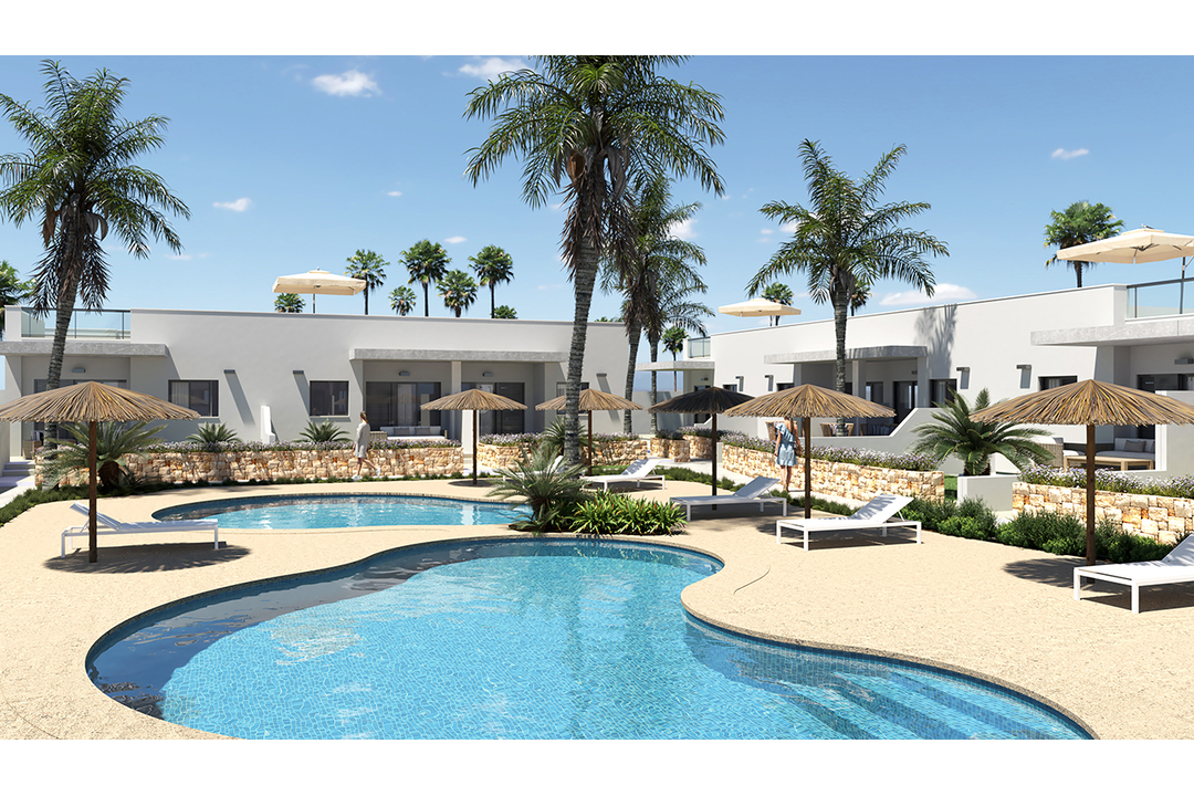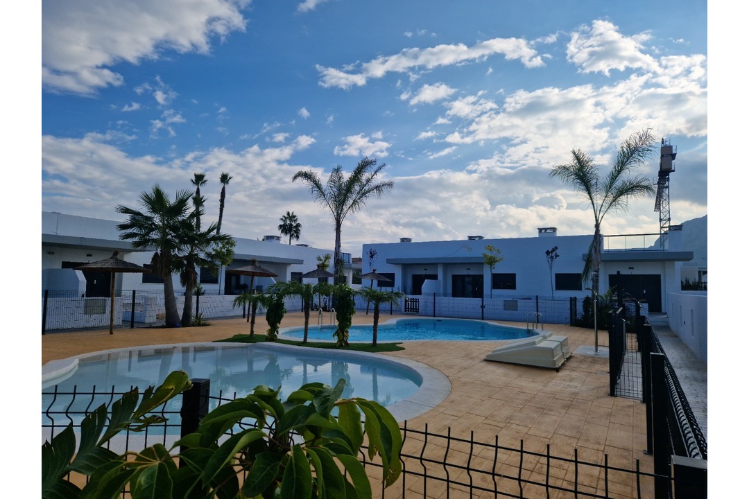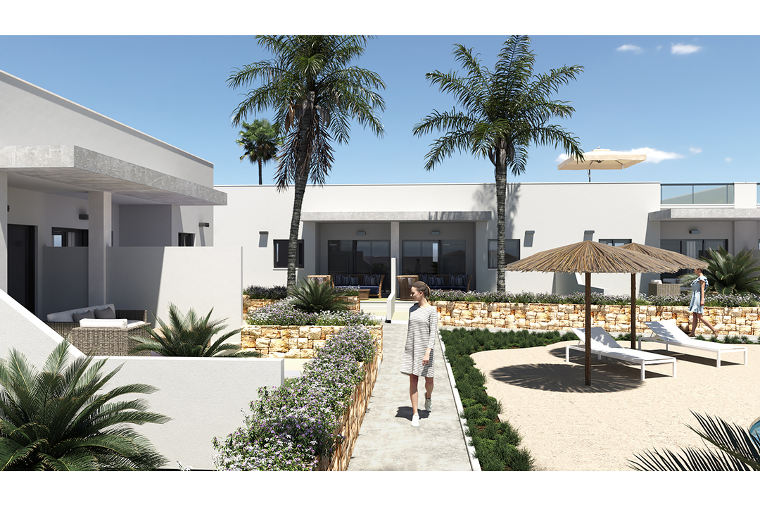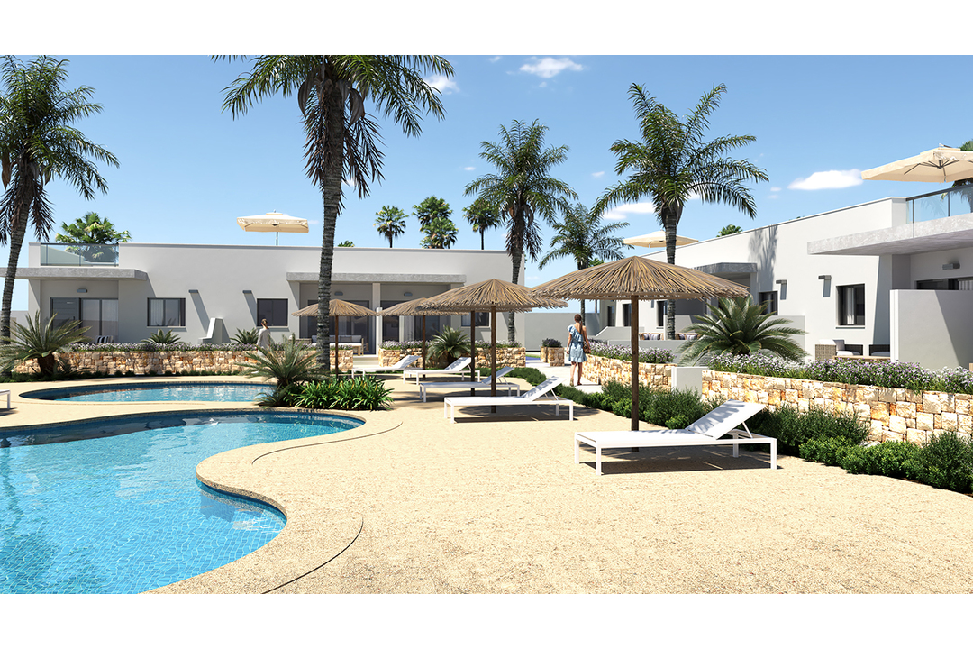 A small residential development of 14 bungalows and semi-detached villas with extensive garden areas and community pools which each property looks onto. There are 2 or 3 bedrooms, 2 bathrooms, kitchen, living room and large terraces all designed with exquisite taste. These modern properties are just a short walk to the local shopping centre and the sandy beaches of Los Marinas.