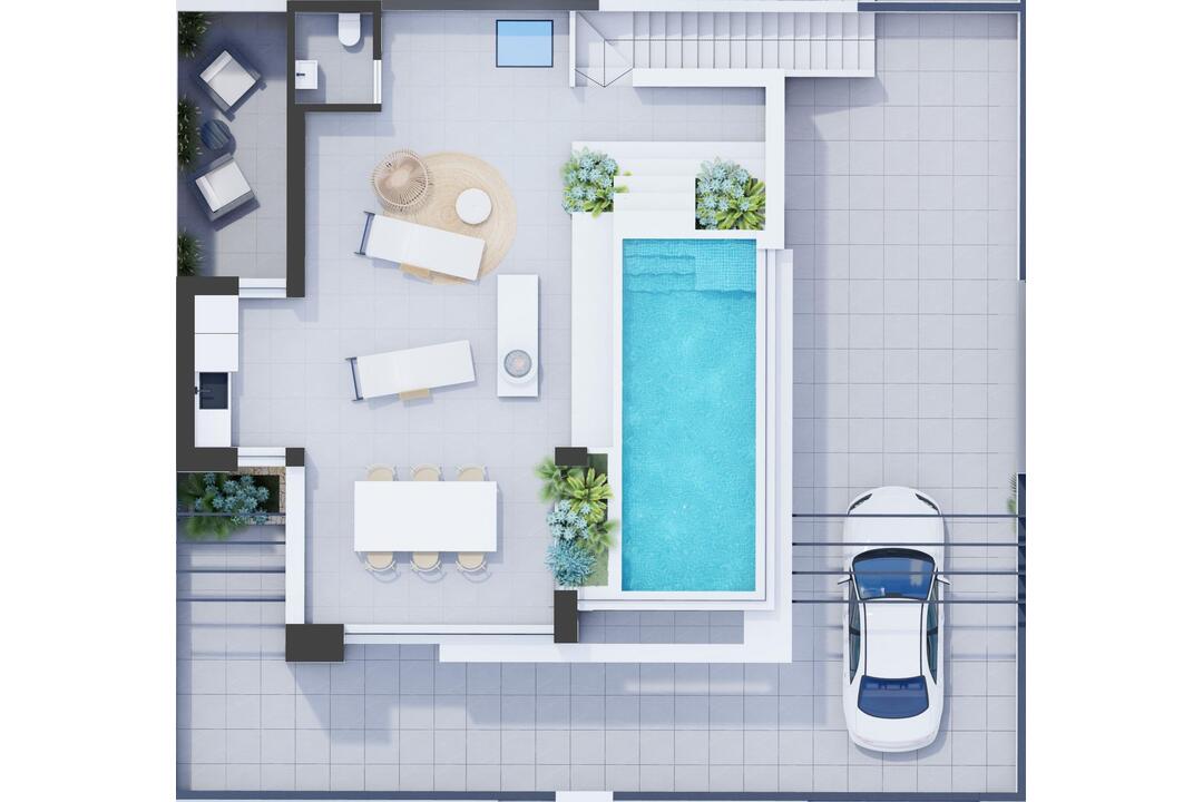 NEW BUILD QUADS IN PRIVATE GATED RESORT IN PROVINCE OF MURCIA New Build modern villas with 3 bedrooms, 2 bathrooms, open plan kitchen with spacious living room all on one level, fitted wardrobes, large impressive multi purpose fully finished basement and solarium with private pool. Modern villas located in a great central position close to the lagoon. Private gated resort with a main access entrance and 24 hours security. The resort is designed around an impressive 126.000 m2 green area. It comprises walking and cycling paths, sport facilities, paddle and tennis courts, a mini-golf course, gardens, dog parks, leisure areas, clubhouse. Also in the central area is the jewel of the resort, a crystal-clear artificial lake of almost 17.000m2 of water surface, surrounded by white sandy beaches and palm trees, bringing a piece of the Caribbean to the Murcia Region. There are 2 islands in the lake, one of them has its own bar, there are also beach Chiringuitos spread around the lake. The resort is strategically located less than 4 km from the beach and the town of Los Alczares, where you can practice various water sports, surrounded by several golf courses and the city of Cartagena less than 15 minutes by car and 22 km from Murcia airport, therefore having a wide cultural, gastronomic and sports offer within reach.