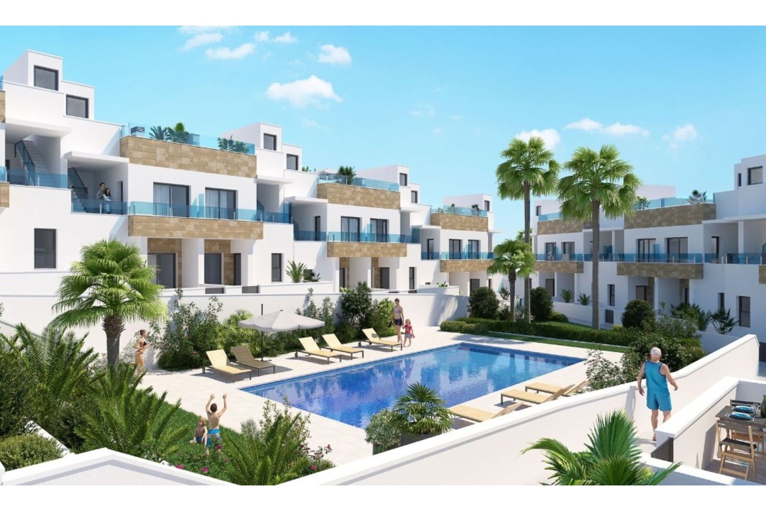 18 new Townhouses located next to the scenic and recreational area of La Pedrera, with magnificent views of the Sierra de la Vega Baja, all amenities accessible in the town of Bigastro and in the city of Orihuela, and only 25 minutes from the beaches of Orihuela Costa and Torrevieja on the Costa Blanca. On the ground floor we find a parking space and rear terrace with access to the main street, a large living-dining area and open kitchen, 1 bedroom, 1 bathroom and front terrace with views and access to the pool. The first floor is distributed in 2 bedrooms with fitted wardrobes, 2 bathrooms en-suite and terrace. On the top we find a large solarium with nice views of the surroundings, the perfect place to enjoy our most precious asset: a sun that shines most of the year. The qualities and finishes of this new building are excellent: all the properties include automated blinds, underfloor heating in all bathrooms, pre-installation of air conditioning ducts, hydromassage column in bathroom.