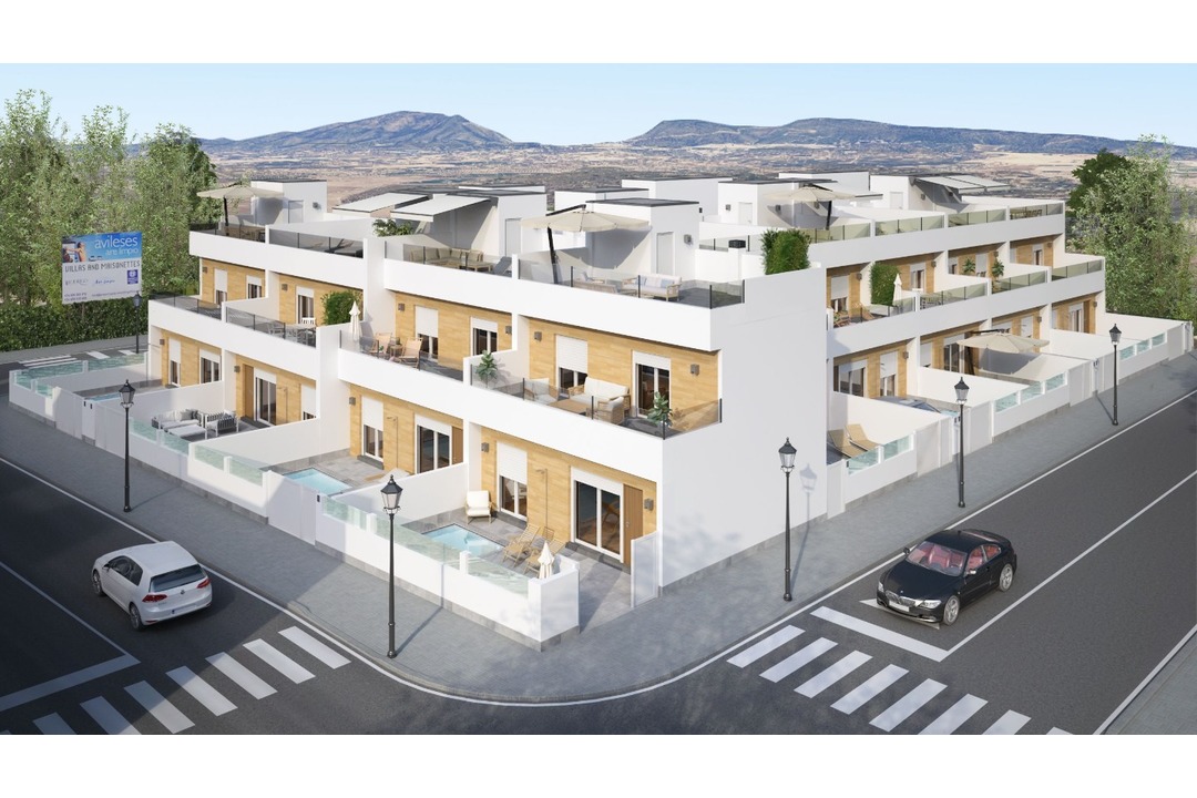 This is a luxury complex of 14 townhouses each with it's own private swimming pool and parking on the plot. These properties have different terraced areas and large solarium, allowing you to enjoy all hours of sunshine every day of the year. Each property has 3 bedrooms and 2 bathrooms. The properties have been designed on three levels with a contemporary style and open planned concept, comprising a fully-fitted kitchen and lounge-dining room. The development is located in Avileses (Murcia), surrounded by all services and sports facilities, near several Golf Courses such as La Torre Golf and Hacienda Riquelme, plus being 20 minute drive to Murcia airport and 15 minute far from Mar Menor and Mediterranean beaches. The properties will meet the highest standards and will be equipped with: Private pool with shower. Kitchen completely furnished and equipped with Balay electrical appliances: ceramic hob, oven and microwave on top, extractor fan, integrated fridge and dishwasher. Fully fitted bathrooms with: suspended toilet, vanity unit, mirror and rainfall shower column. Lined wardrobes with drawers. Interior lighting in kitchen, living room, hallway and bathrooms with led spotlights. Wall integrated led spotlights at the garden and solarium. Pre-installation for air conditioning.