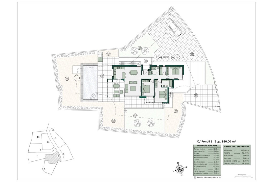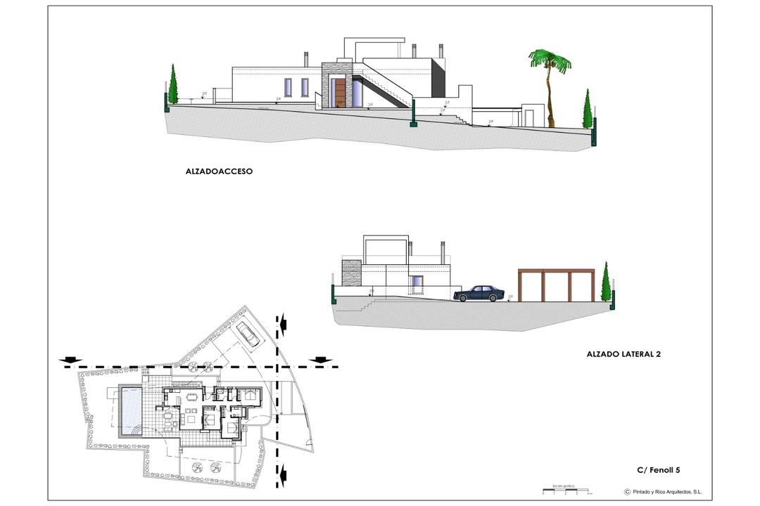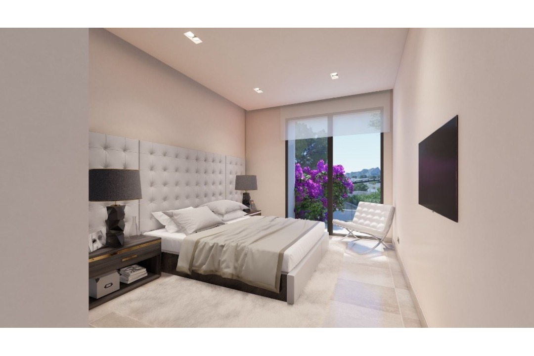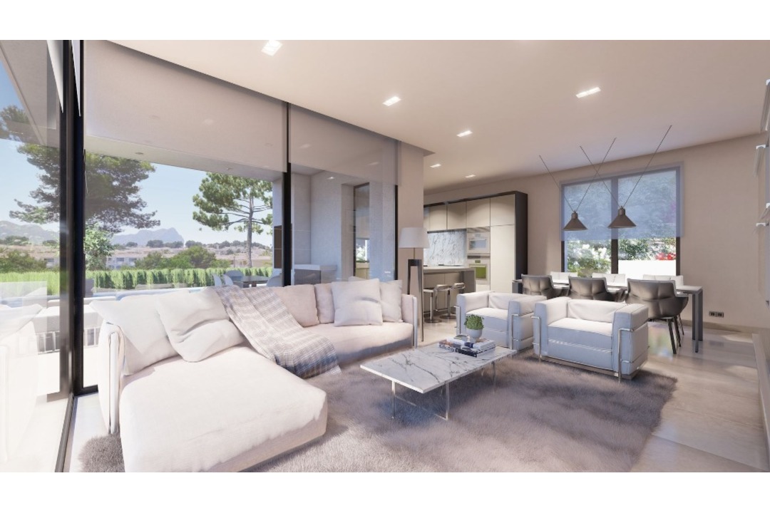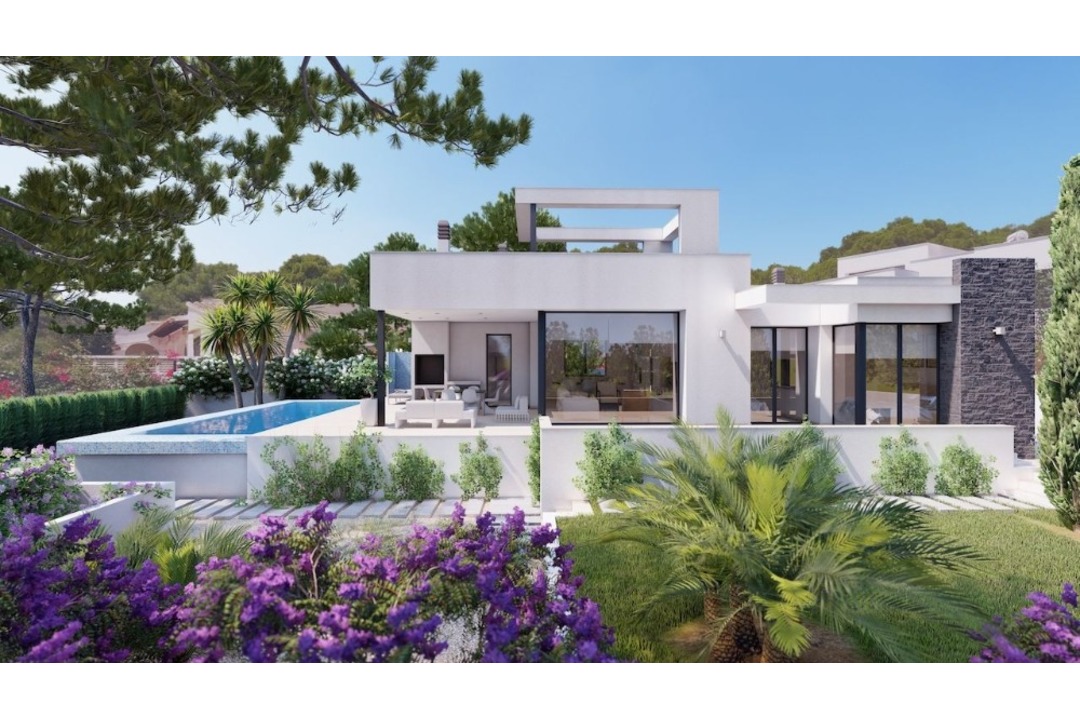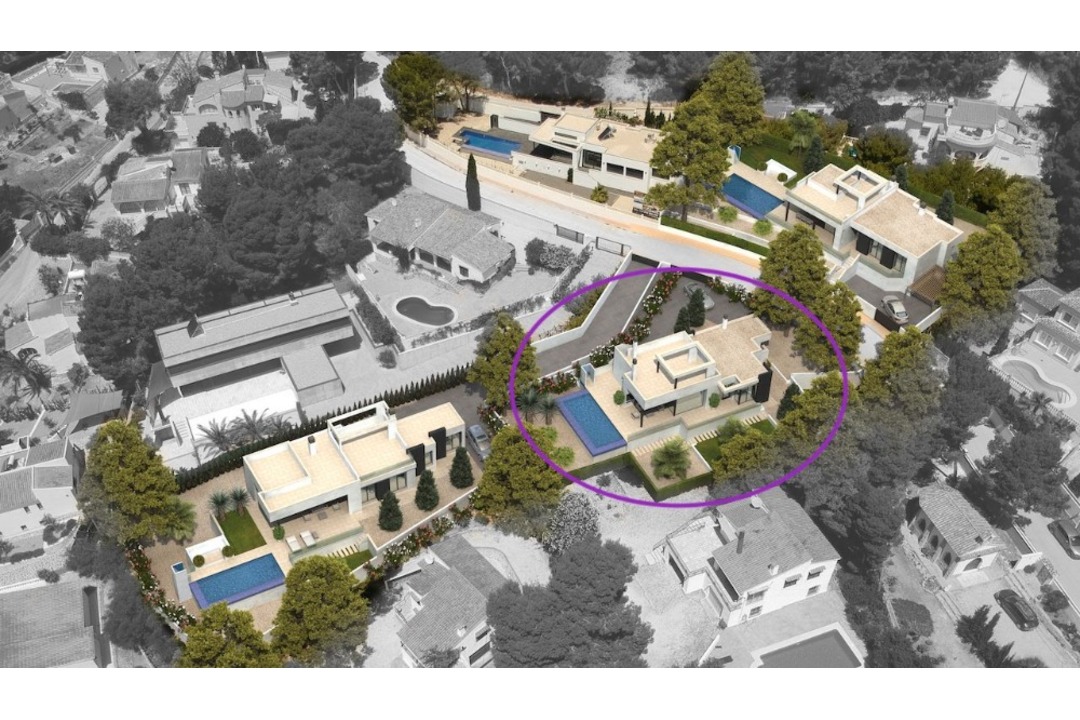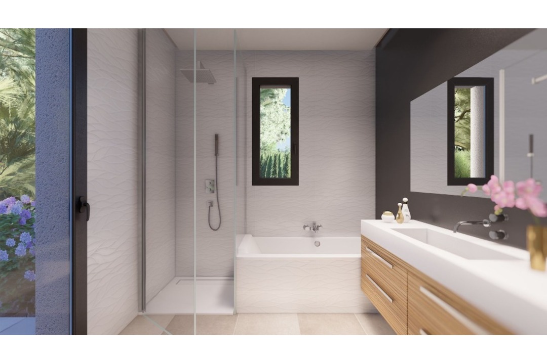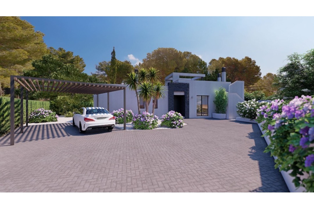 A new villa in a tranquil location but only 1 km to the sandy beaches of La Fustera with restaurants, bars and a supermarket. There you can take the ecological path which takes you to Calpe. The villa is surrounded by pine trees and has sea and mountain views. The villa is constructed in a single floor, turning it into a practical and functional house. From the entrance you get access to the hall, where you will find on the left side the night area distributed into 3 bedrooms. The master room has an individual bathroom with dressing room and the adjacent bedrooms have a shared bathroom. As well we can find the laundry room. The kitchen is completely open to the dining room and living room, from where you can directly access to the terrace and swimming pool and garden.