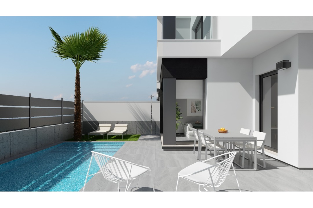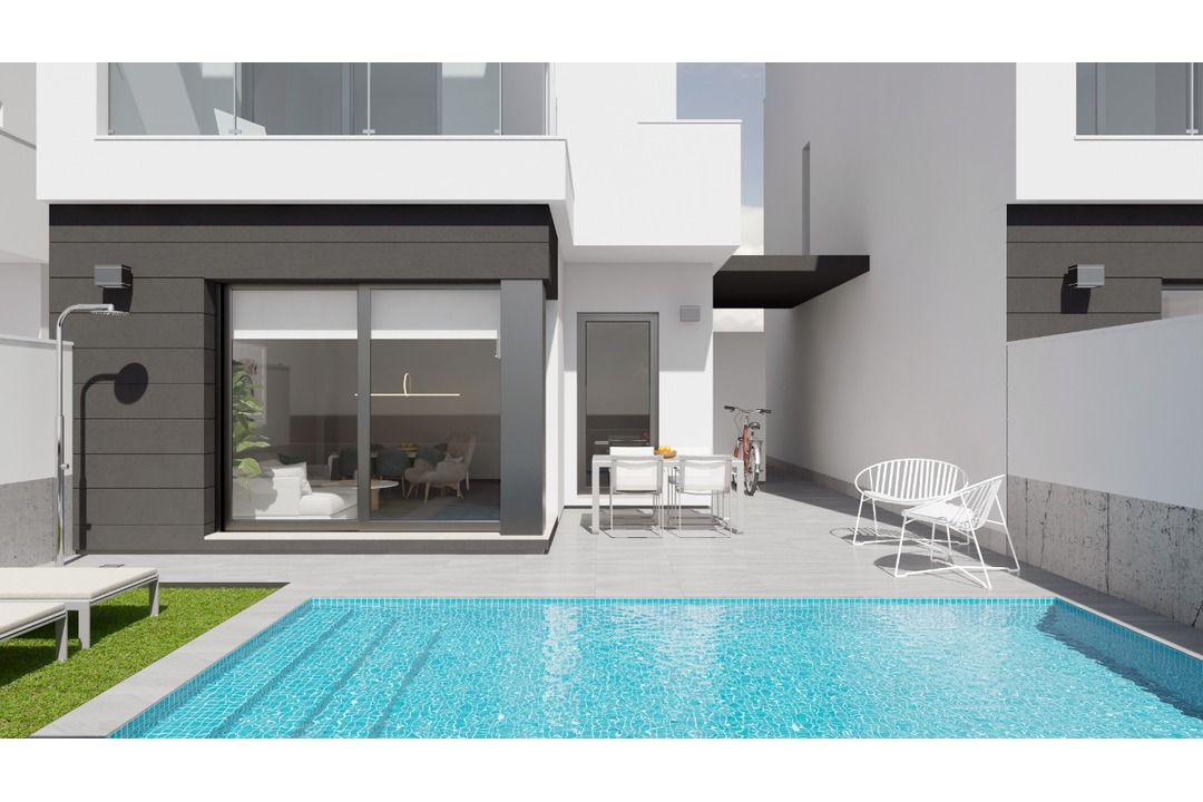 A development of 14 modern villas, with private pool, terraced areas and solarium. The villas have 3 bedrooms and 2 bathrooms and have been designed with a contemporary style and an open planned concept, consisting of a fully-fitted kitchen and lounge-dining room. The development is located in Santiago de la Ribera, Murcia, surrounded by all services, sports facilities, near several Golf Courses and 5 minutes walk from Mar Menor beaches and 10 minutes to the Mediterranean Sea. The property has the highest standards and will be equipped with: Private swimming pool. The kitchen is completely furnished and equipped with a ceramic hob, extractor fan, oven, microwave, fridge in crystal finish, and integrated dishwasher. LED Lighting: inside the property (kitchen, corridors and bathrooms), as well as in outdoor areas. Lined wardrobes with drawers. Fully fitted bathrooms with suspended vanity unit, toilet, mirror, shower and shower screens. Electrical wall towel heaters. Pre-installation for ducted air conditioning. Motorized blinds in bedrooms. Motorized parking gate. Solarium.