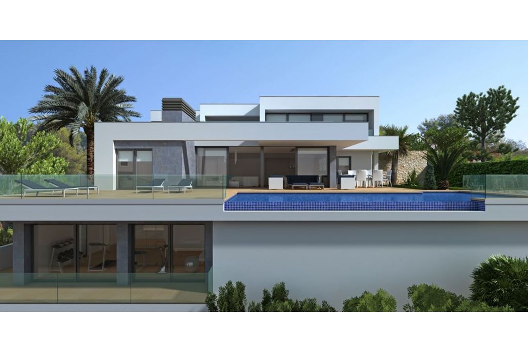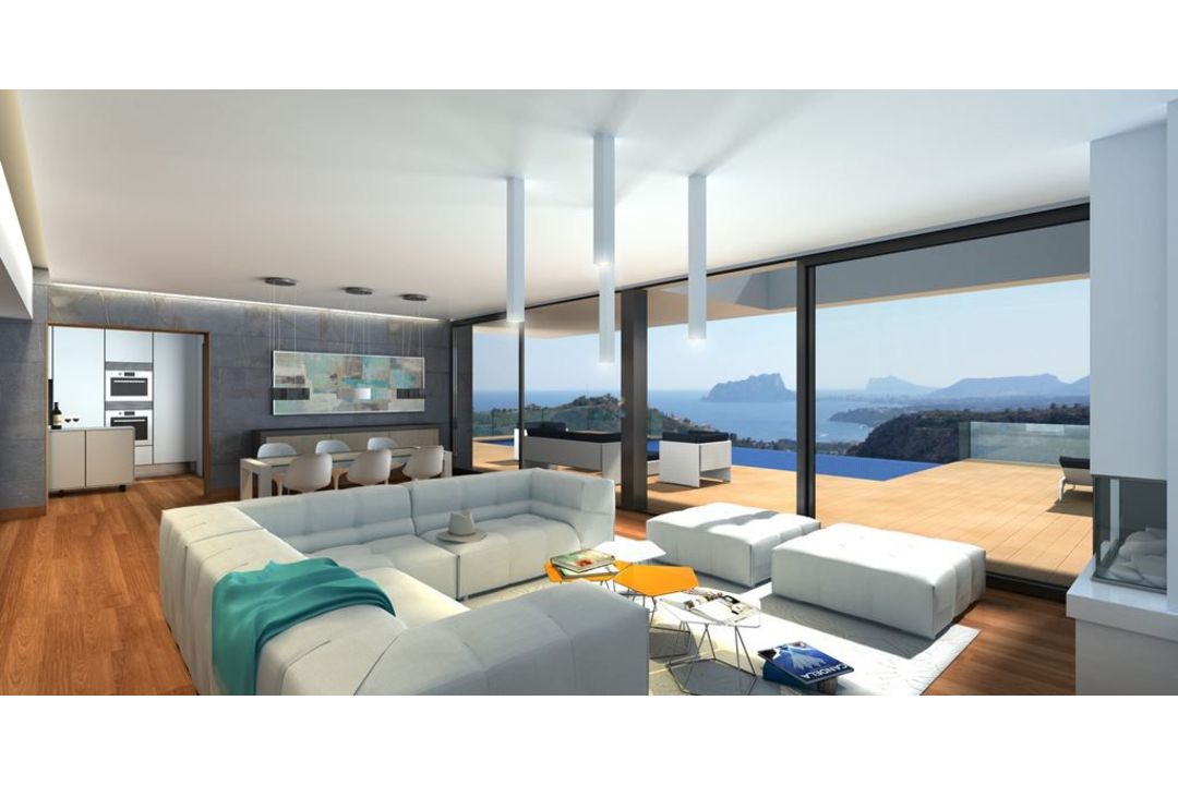 Modern villa for sale Ifach is the name given to the house designed and projected on plot no. 190 at the Magnolias Plus residential area, a consolidated urbanization, with houses of similar characteristics, complete infrastructure and stunning views of the sea and the Mediterranean coast, with the Ifach Rock in the background.The pure, minimalist design defines this property, where straight lines play with volumes creating unique spaces. Villa Ifach stands on a 1,089sqm plot. It has three floors, with a total built area of approximately 440sqm, and 3 bedrooms, all with their own en-suite bathrooms. The master bedroom is equipped with bath and shower, his and her side by side washbasins, a fireplace and dressing room.The middle floor is the main floor of the home, housing a large kitchen, laundry room, storage room, guest toilet and a spacious living room with a fireplace, perfectly balanced with the outdoor areas. Thanks to the huge picture windows, porches and roof overhangs, these outside areas are naturally integrated into the home, providing the light and tranquillity needed to enjoy pleasant moments with loved ones. This home has a double garage, a multipurpose room of 26sqm with a terrace and an infinity edge pool that merges with the Mediterranean Sea, integrated into a terrace of over 116sqm