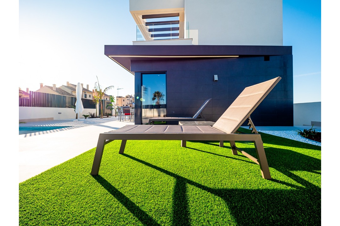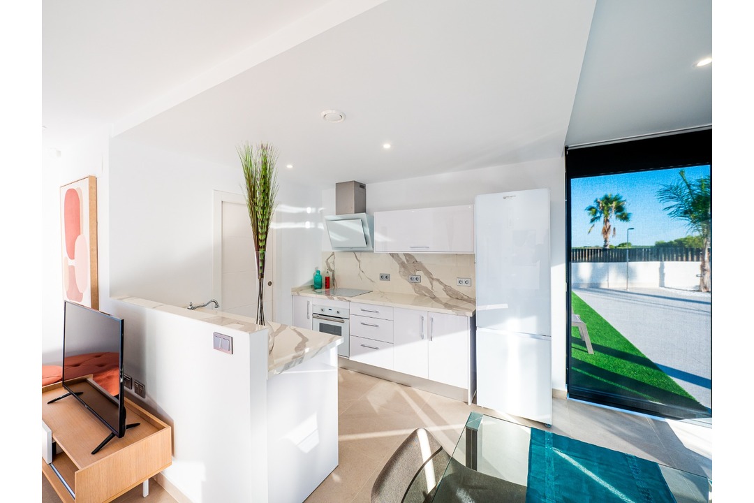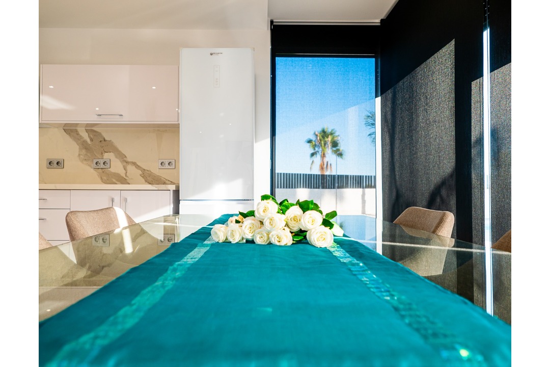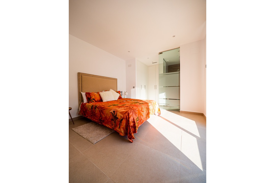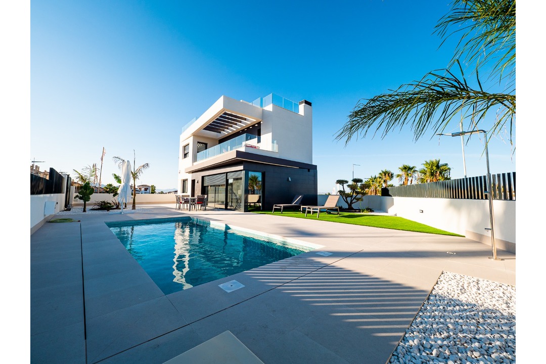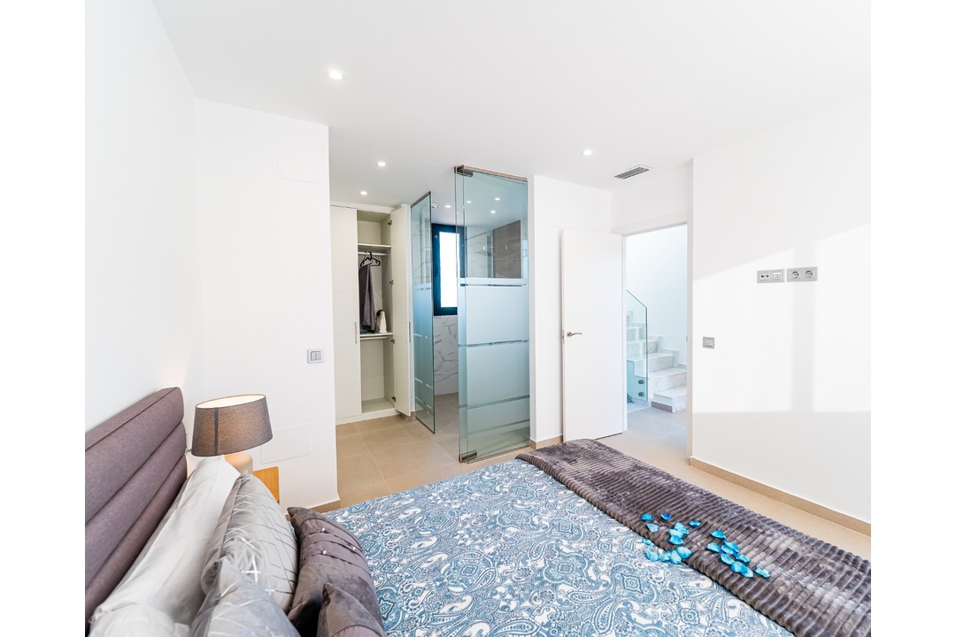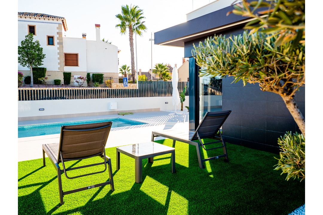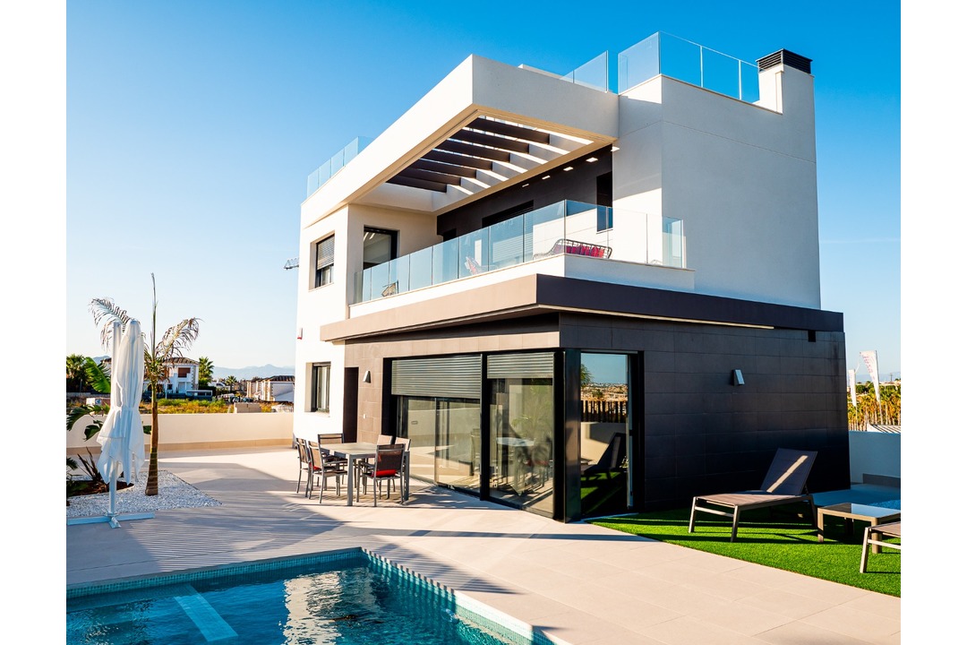 New exclusive villas located in La Finca (Algorfa). These modern style villas come with open plan kitchen and dining area, 3 bedrooms and 3 bathrooms and designed to give space and light. It has a large living-dining room and open kitchen, laundry room, 1 bedroom with a built-in wardrobe and en-suite plus 1 guest toilet all on the ground floor, 2 bedrooms with en-suites upstairs. There is a private garden and swimming pool.