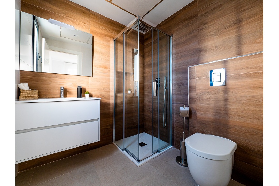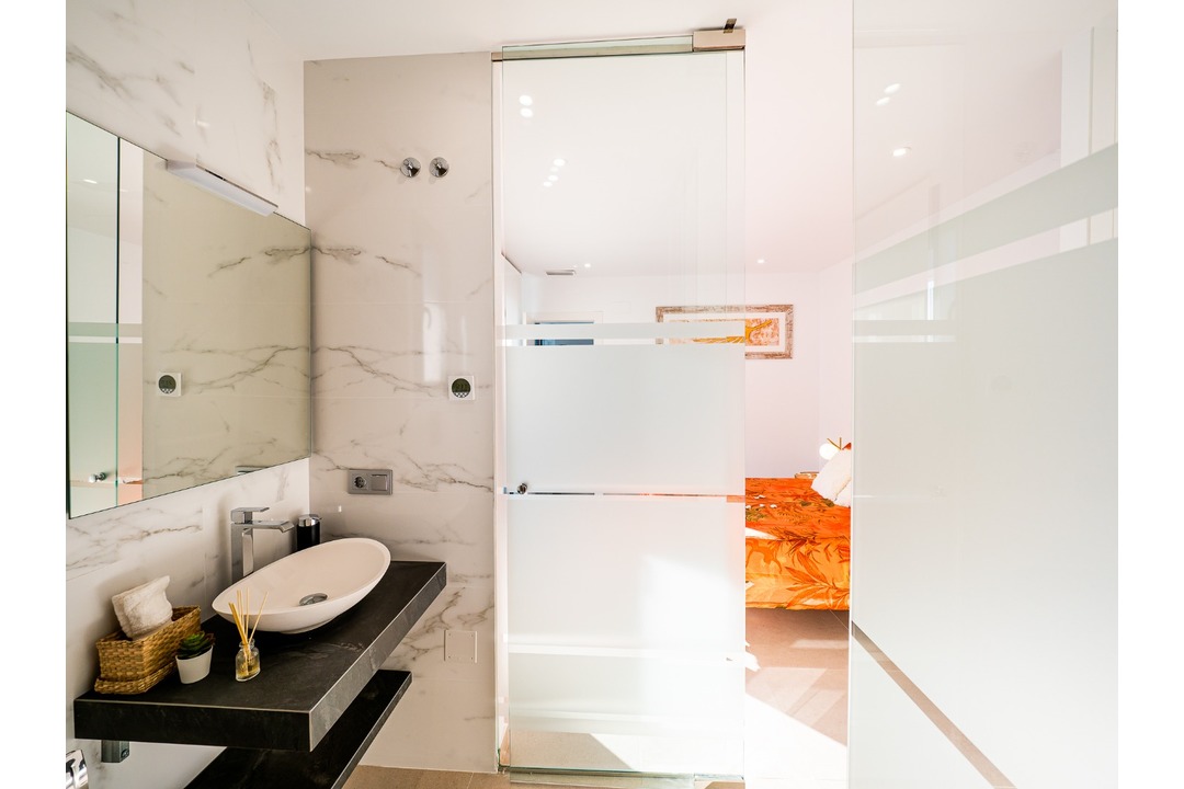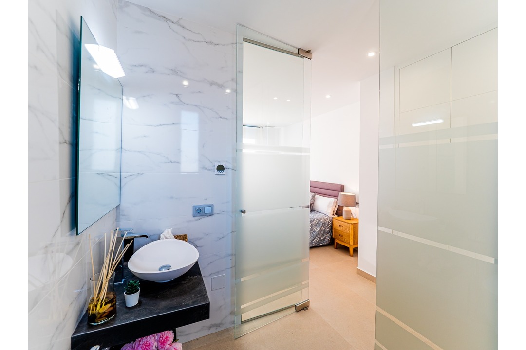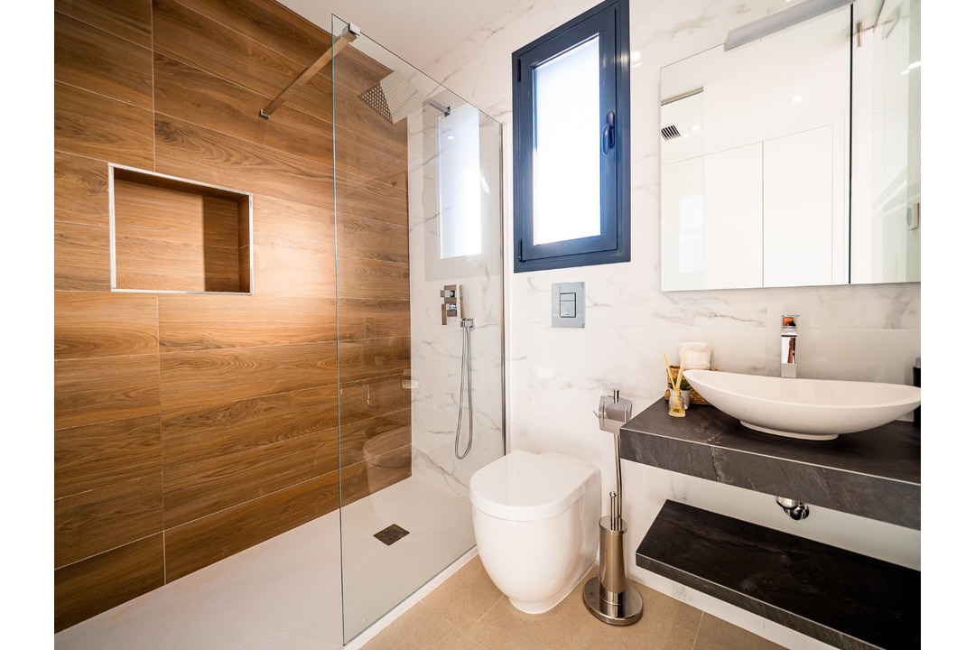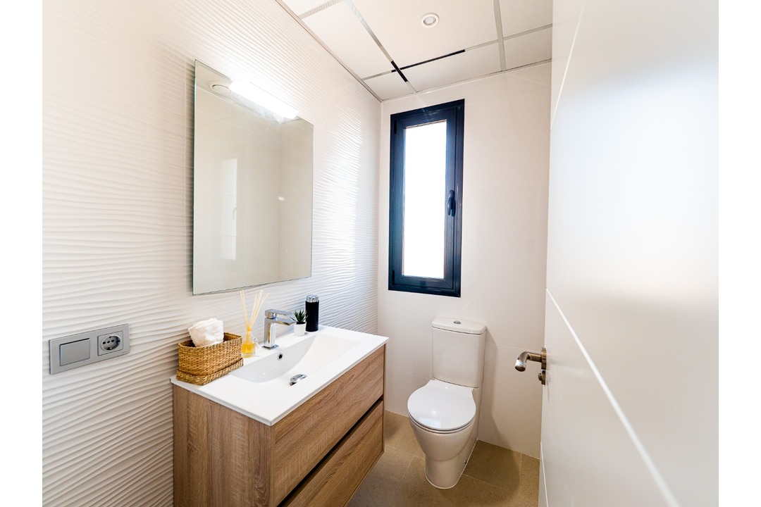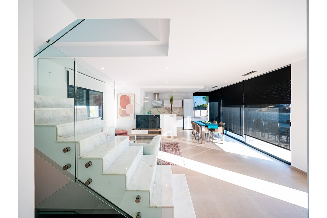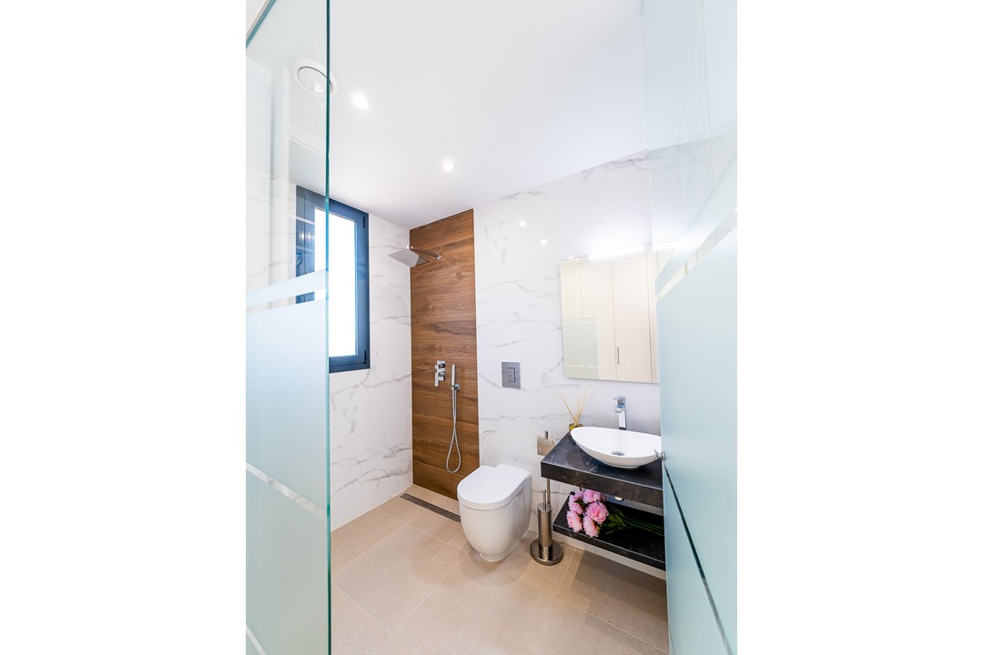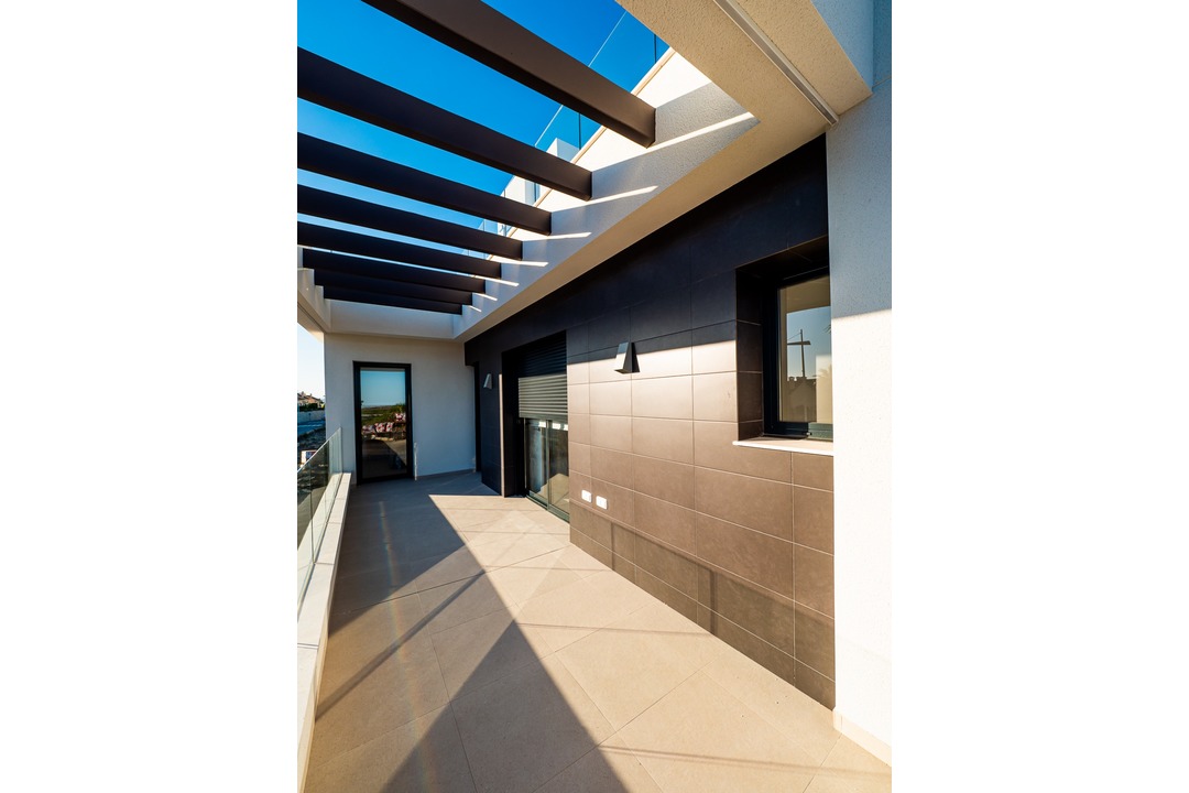 New exclusive villas located in La Finca (Algorfa). These modern style villas come with open plan kitchen and dining area, 3 bedrooms and 3 bathrooms and designed to give space and light. It has a large living-dining room and open kitchen, laundry room, 1 bedroom with a built-in wardrobe and en-suite plus 1 guest toilet all on the ground floor, 2 bedrooms with en-suites upstairs. There is a private garden and swimming pool.