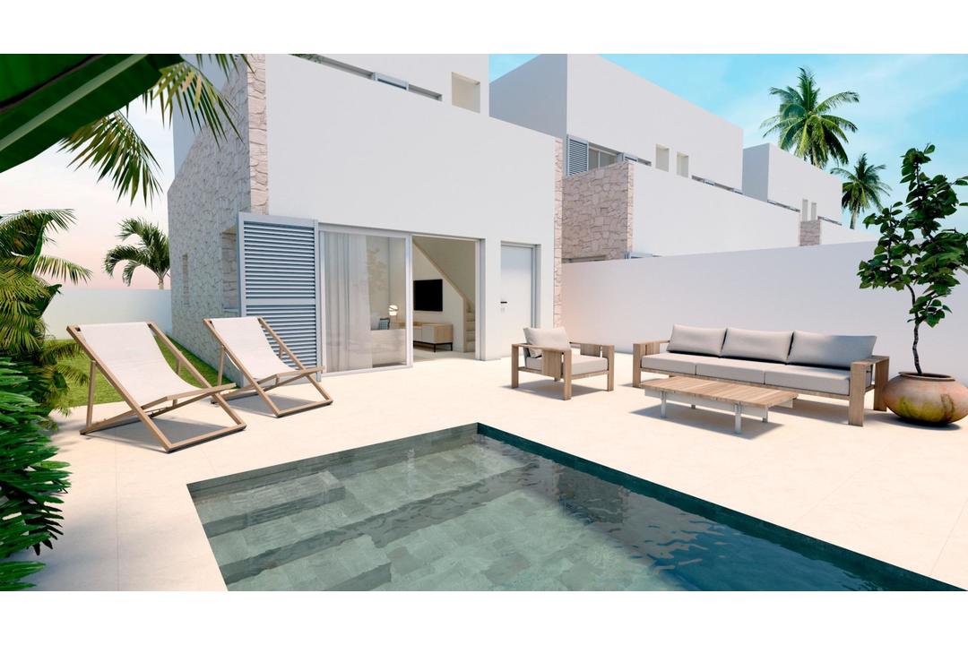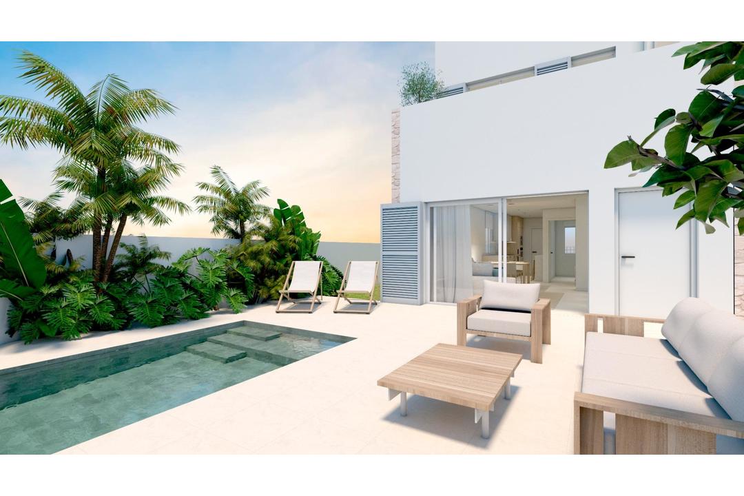 NEW BUILD RESIDENTIAL COMPLEX IN TORRE DE LA HORADADA New Build residential complex of bungalows and villas in Torre de la Horadada only 450m from the beach. Beautiful semi-detached villas has 3 bedrooms, 2 bathrooms, open plan kitchen with the lounge area, fitted wardrobes, terrace and solarium, private garden with the pool. All properties has private parking. Torre de la Horadada is located south of Alicante in a beautiful location on the coast. The beautiful beaches of Torre de la Horadada and Mil Palmeras have fine sand beautiful promenade. There are lots of restaurants, bars and shops, also water sports, diving and snorkelling. It is well connected just 40 minutes from Alicante and Murcias Corvera airports, with large commercial shopping centres and multiple golf courses all within easy reach.