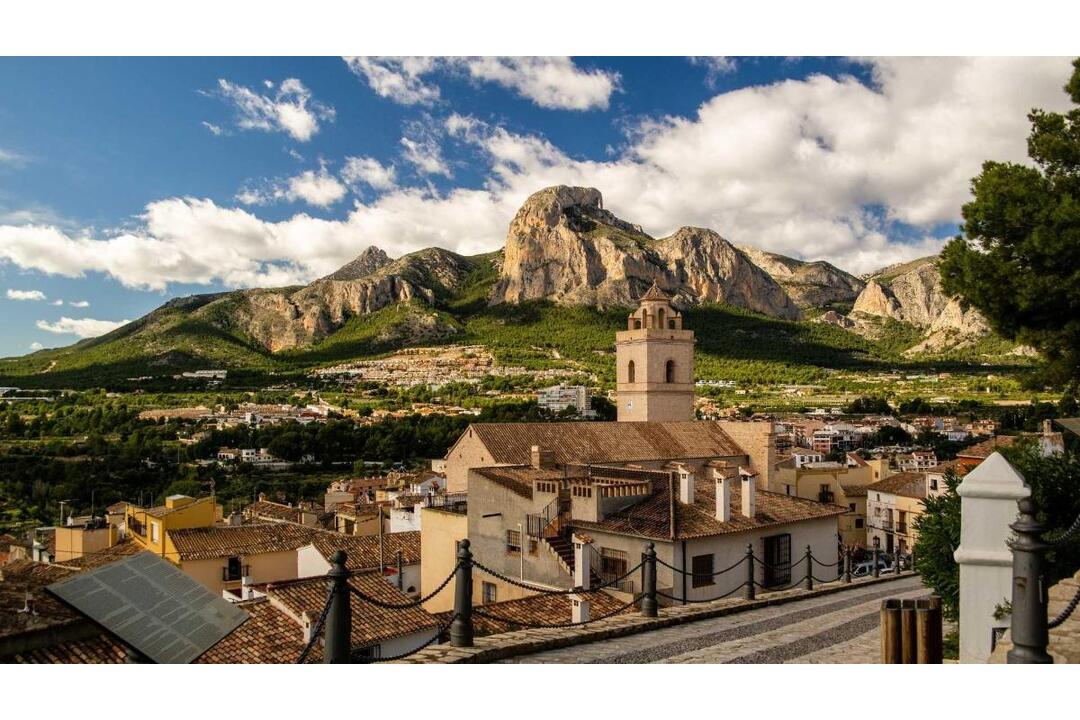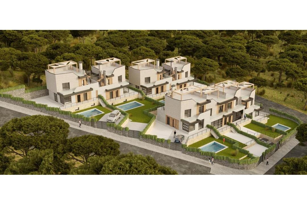 NEW BUILD SEMI-DETACHED VILLAS IN POLOP New Build modern townhouses and semi-detached villas with several terraces and solarium, totally fenced, with parking area for vehicles and private swimming pool in Polop. Modern properties with 3 spacious bedrooms with built-in wardrobes (the main one on the ground floor, with bathroom and dressing room en suite), 2 spacious bathrooms, large living-dining room with open kitchen, spacious terraces. Kitchen equipped with base units and silestone worktops, with ceramic hob, oven, extractor hood, fridge, washing machine, dishwasher, and aerothermal heater. First qualities: interior carpentry in wood and white lacquered laminates, exterior carpentry in anthracite grey pvc with double glazing and thermal bridge break, and automatic blinds with aluminium slats, ceramic floors of 1st quality non-slip, smooth walls, security door with 5 anchor points, large built-in wardrobes. The city of Polop offers an amazing range of options for lovers of the great outdoors surrounded by nature and unparalleled peace. The municipality enjoys a Mediterranean climate with cooler temperatures and cleaner air, located less than 10 kilometres from Benidorm, Altea and their beaches. It stretches from the rivers Guadalest and Algar to the town of Villajoyosa, including the beaches of Albir and Benidorm; inland it borders Callosa and Guadalest.