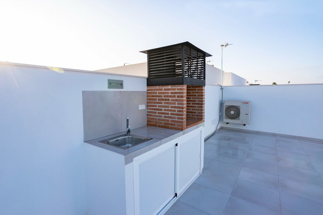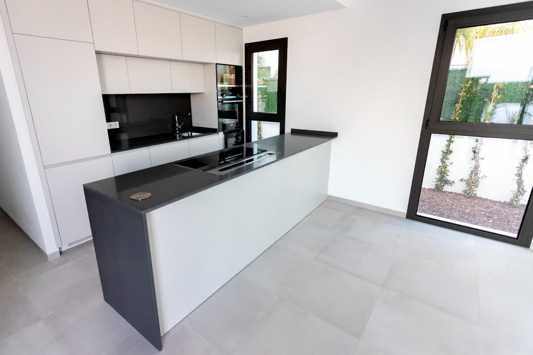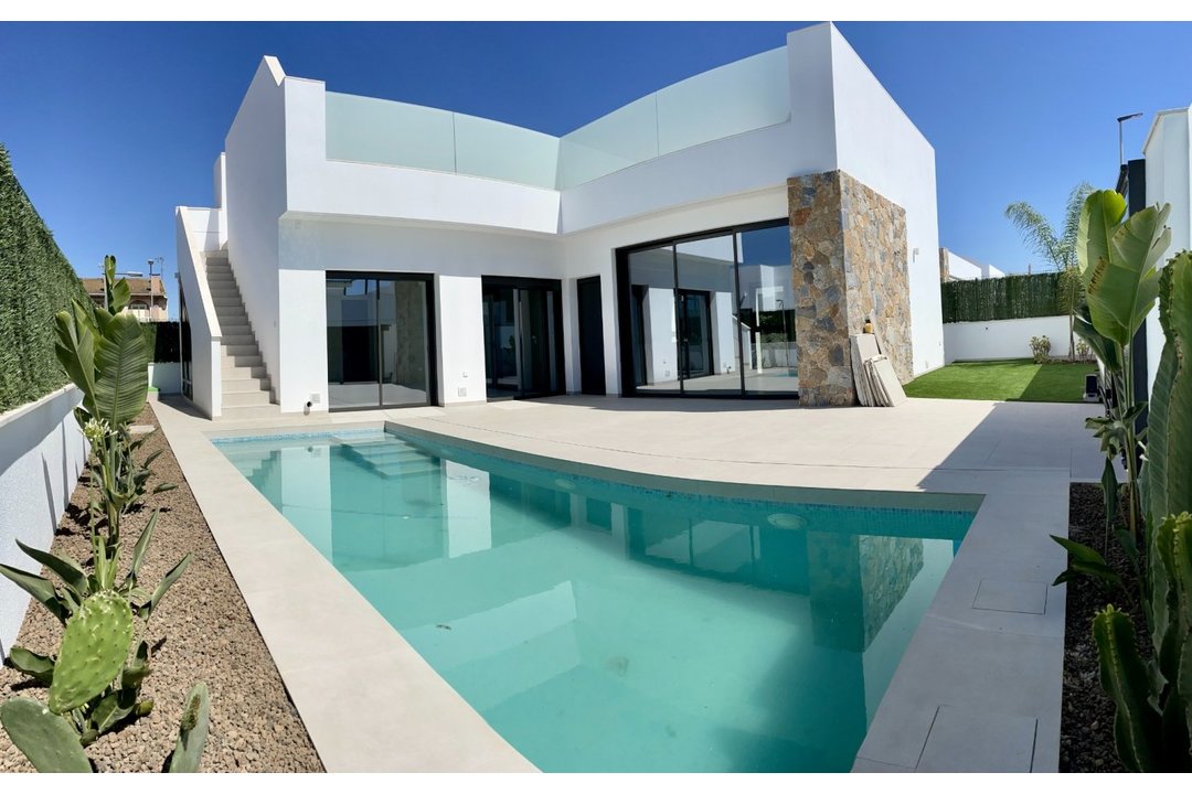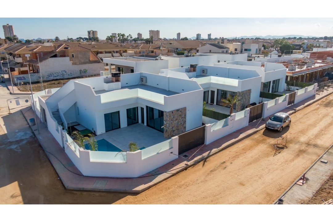 NEW BUILD ONE LEVEL VILLA IN SANTIAGO DE LA RIBERA Beautiful one level villas with 3 bedrooms and 2 bathrooms located 900 meters from the Santiago De La Ribera beaches. They all have a bright living room with modern open kitchen and sliding windows connecting with the front terrace and private swimming pool. All the bedrooms have fitted wardrobes. There is also a big solarium where you can sunbath the whole year, a private parking space on the plot and the garden. Located in Santiago De La Ribera and just 900 m from the sea is this a perfect location to enjoy the fantastic climate with its beautiful promenade. Here you will find all facilities at walking distance such as many good restaurants, great tapas bars, coffee bars and supermarkets. The free mudbaths of Lo Pagan are also at walking distance. This area offers a variety of water sports activities and is just 20 minutes from La Zenia Boulevard and Cartagena city. Murcia Corvera airport is a 30 minutes drive. Alicante airport is a 50 minutes drive.