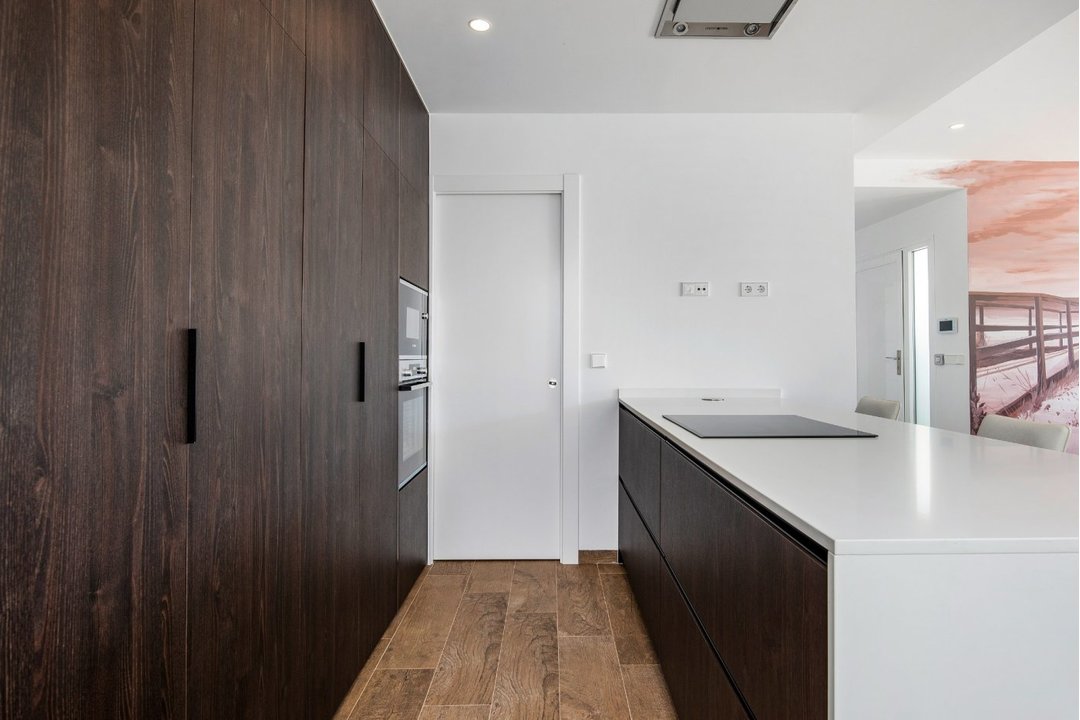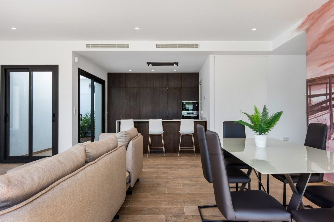NEW BUILD ONE LEVEL VILLA IN SANTIAGO DE LA RIBERA Beautiful one level villas with 3 bedrooms and 2 bathrooms located 900 meters from the Santiago De La Ribera beaches. They all have a bright living room with modern open kitchen and sliding windows connecting with the front terrace and private swimming pool. All the bedrooms have fitted wardrobes. There is also a big solarium where you can sunbath the whole year, a private parking space on the plot and the garden. Located in Santiago De La Ribera and just 900 m from the sea is this a perfect location to enjoy the fantastic climate with its beautiful promenade. Here you will find all facilities at walking distance such as many good restaurants, great tapas bars, coffee bars and supermarkets. The free mudbaths of Lo Pagan are also at walking distance. This area offers a variety of water sports activities and is just 20 minutes from La Zenia Boulevard and Cartagena city. Murcia Corvera airport is a 30 minutes drive. Alicante airport is a 50 minutes drive.
