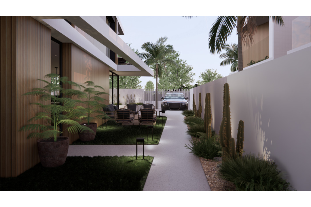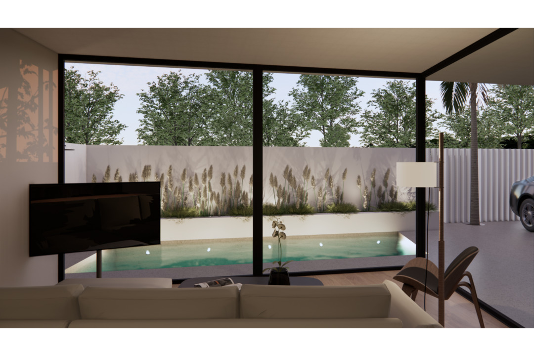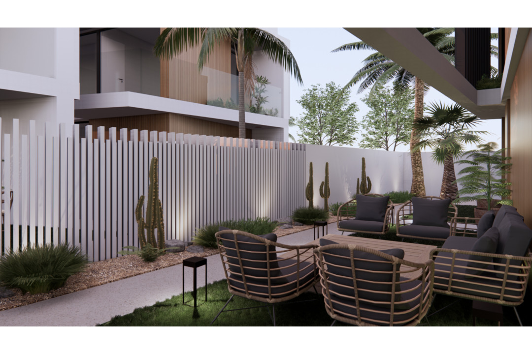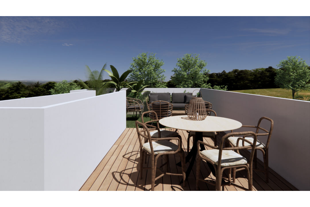 These new villas are constructed over two floors with a roof terrace. On the ground floor there is one double bedroom, a bathroom and an open plan kitchen with an island and living area. On the first floor of the villas, there are two more bedrooms and two bathrooms, one of them en-suite. In all villas, the master bedroom also has a terrace on this floor. In some of the villas, even the third bedroom also has a terrace. At the top of the villas, you will find its large 50m2 roof terrace with sea views. From the living room there is access to the beautiful garden with a private pool. The rest of the plot is covered with artificial grass, one or two terraces and a parking space.
